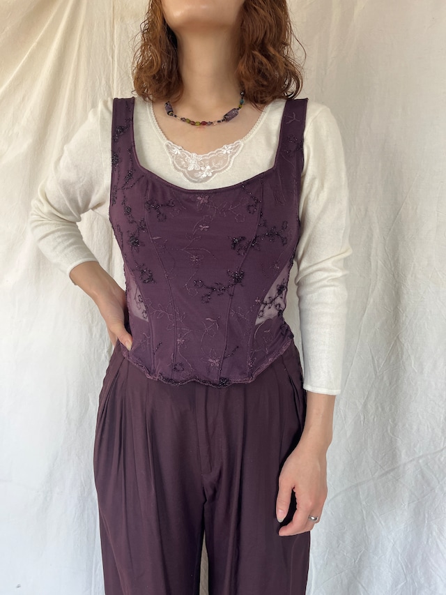 キラキラな刺繍が可愛いパープルのビスチェ。 ニットやシャツ、ワンピースに重ねて プラスワンアイテムとしておすすめ♡ 【MEMO】 made in Italy 【CONDITION】 B *Condition Rank* S 新品・未使用品 A 使用感やダメージがほぼ見受けれない状態 B 多少の使用感が見受けられるが、特記すべきダメージは無い状態 C 使用感があり、目立ちにくいダメージや補修跡がある状態 D 目立ったダメージや補修跡がある状態 ※当店ではused/vintageを扱っております。目安となる上記ランクをご参考くださいませ。 【MATERIAL】 ポリエステル 60% ナイロン 25% ポリアミド 10% エラスタン 5% 【SIZE】 平置き(cm) 身幅: 41cm 総丈: 役45cm モデル身長 161cm 【ATTENTION】 ・当店は一点物のUsed/Vintage商品を中心に取り扱っております。 アイテムごとに程度は異なりますが、古着特有の使用感、小さなほつれなどがある場合がございます。コンディション等の確認は行っておりますが、全てを記載することは古着という商品の特性上困難です。古着ということを理解頂いた上で購入をお願い致します。 ・手作業での採寸の為、多少の誤差があることをご理解・ご了承の上ご注文くださいませ。 ・掲載商品の画像に関しまして、ご覧になっているブラウザやパソコンなどの環境により、実際のカラーと異なる場合がございます。予めご了承くださいませ。 ・こちらの商品は店頭でも販売しておりますため、行き違いでSOLD OUTになった際はご購入頂けない場合がございます。予めご了承くださいませ。 ・御注文後のお客様都合によるキャンセルや返品は基本的に受け付けておりません。予めご了承下さいませ。 ・写真に写っているお洋服や小物はほとんどが当店の商品です。(一部スタッフ私物) オンラインストアに掲載されていなくても購入可能ですので、お気軽にお問い合わせください。 ・その他気になる点がございましたら、必ずご購入前にお問い合わせください。 【CONTACT】 Instagram DM @bloomydays_femme [email protected]