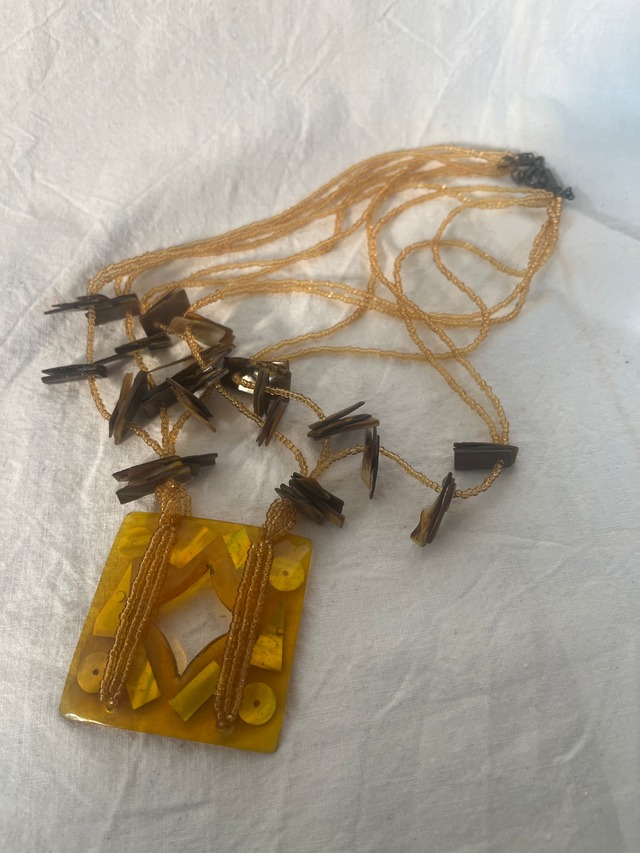 クリアなイエローのビーズとシェルビーズのネックレス。 ジャラジャラっとボリュームたっぷり♡ トップのスクエアの中にはシェルビーズが閉じ込められています。 スタイリングのアクセントに。 シンプルな装いに合わせるだけでグッとボヘミアンな雰囲気になります♡ 【CONDITION】 B *Condition Rank* S 新品・未使用品 A 使用感やダメージがほぼ見受けれない状態 B 多少の使用感が見受けられるが、特記すべきダメージは無い状態 C 使用感があり、目立ちにくいダメージや補修跡がある状態 D 目立ったダメージや補修跡がある状態 ※当店ではused/vintageを扱っております。目安となる上記ランクをご参考くださいませ。 【MATERIAL】 Unknown 【SIZE】 約58〜66cm 【ATTENTION】 ・当店は一点物のUsed/Vintage商品を中心に取り扱っております。 アイテムごとに程度は異なりますが、古着特有の使用感、小さなほつれなどがある場合がございます。コンディション等の確認は行っておりますが、全てを記載することは古着という商品の特性上困難です。古着ということを理解頂いた上で購入をお願い致します。 ・手作業での採寸の為、多少の誤差があることをご理解・ご了承の上ご注文くださいませ。 ・掲載商品の画像に関しまして、ご覧になっているブラウザやパソコンなどの環境により、実際のカラーと異なる場合がございます。予めご了承くださいませ。 ・こちらの商品は店頭でも販売しておりますため、行き違いでSOLD OUTになった際はご購入頂けない場合がございます。予めご了承くださいませ。 ・御注文後のお客様都合によるキャンセルや返品は基本的に受け付けておりません。予めご了承下さいませ。 ・写真に写っているお洋服や小物はほとんどが当店の商品です。(一部スタッフ私物) オンラインストアに掲載されていなくても購入可能ですので、お気軽にお問い合わせください。 ・その他気になる点がございましたら、必ずご購入前にお問い合わせください。 【CONTACT】 Instagram DM @bloomydays_femme [email protected]
