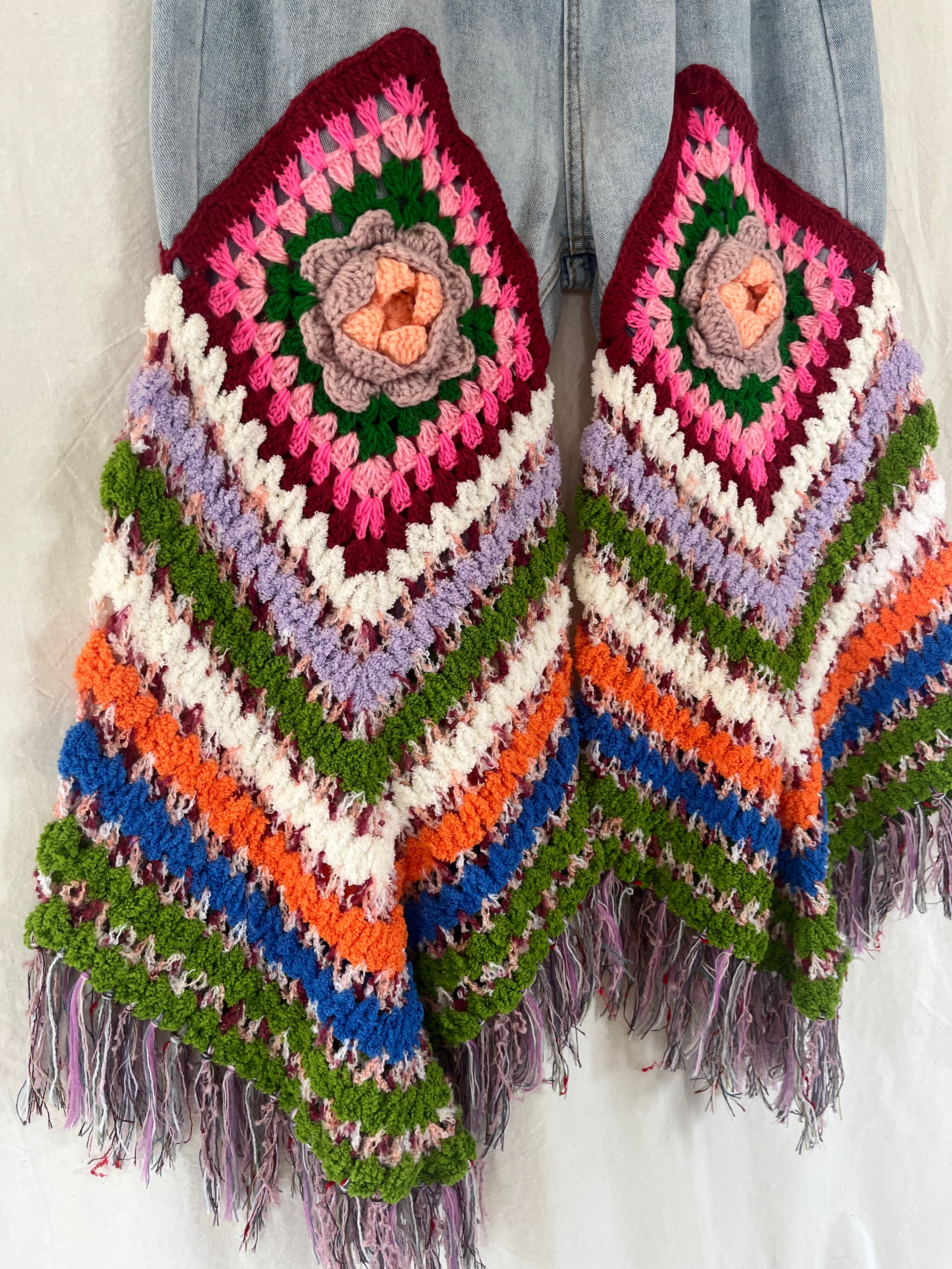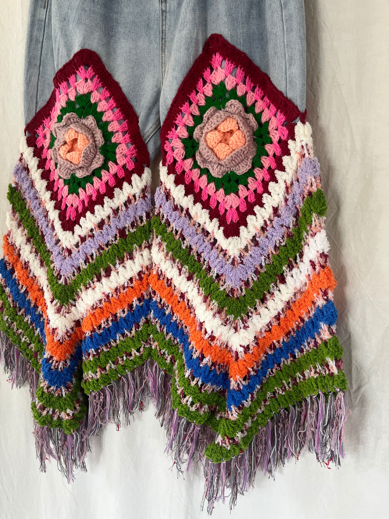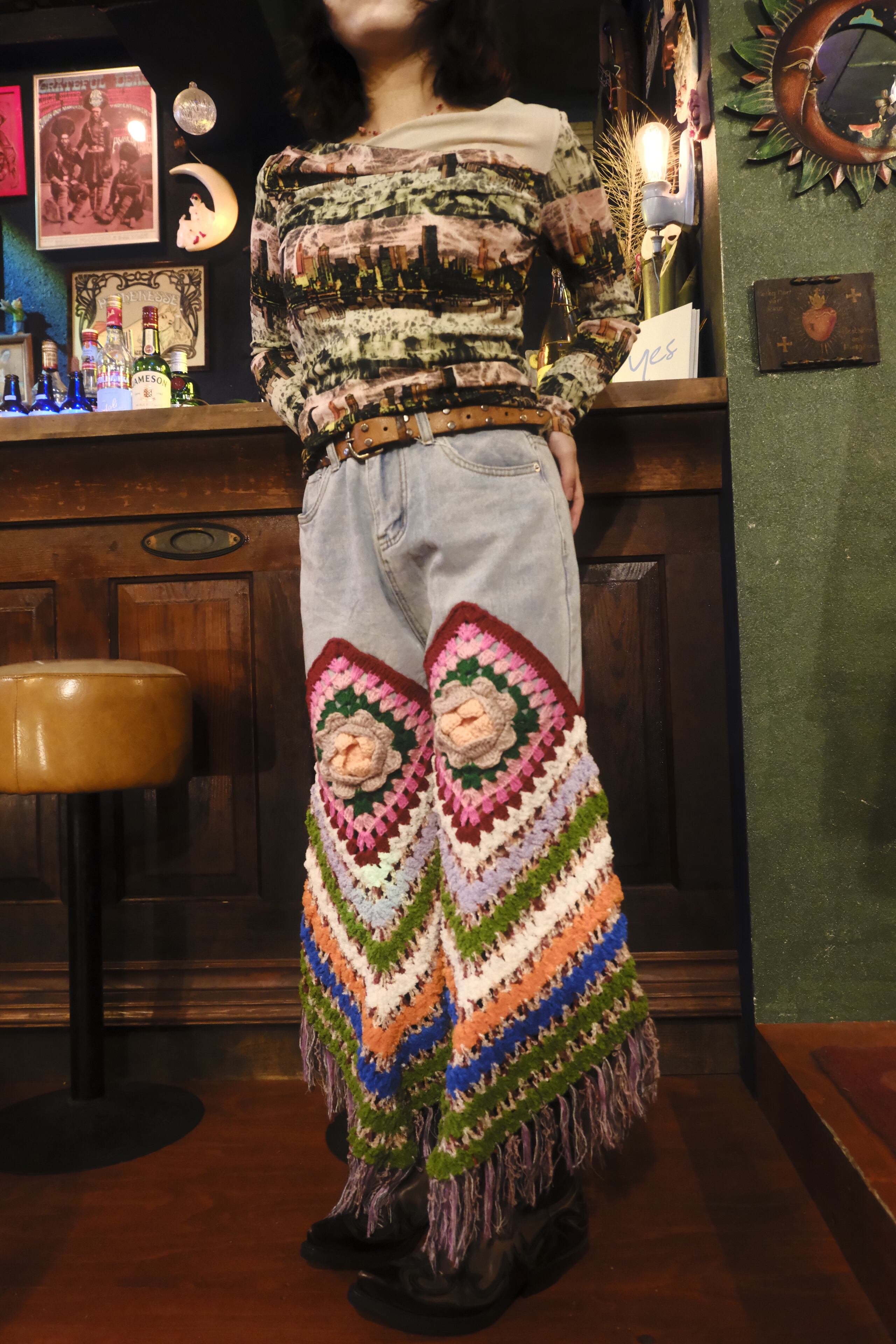 デニムにカラフルなかぎ針編みのニットをドッキングしたリメイクデニムパンツ。