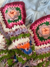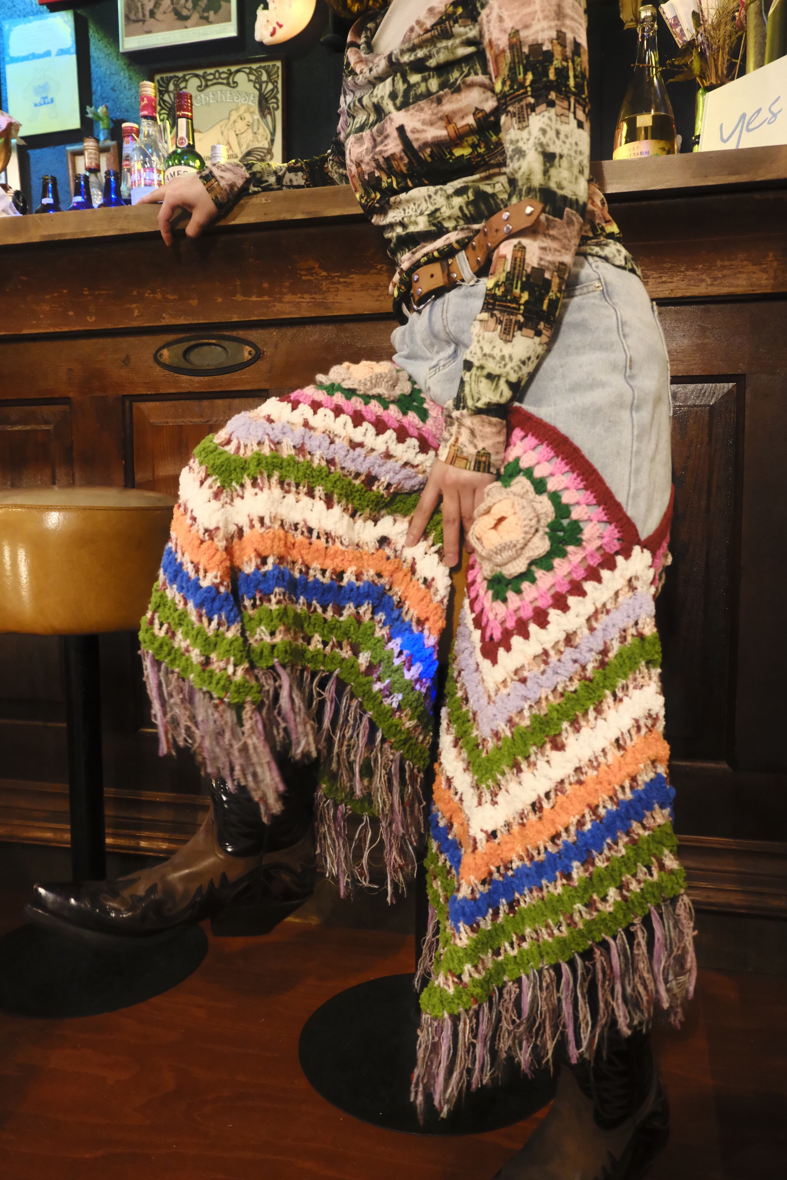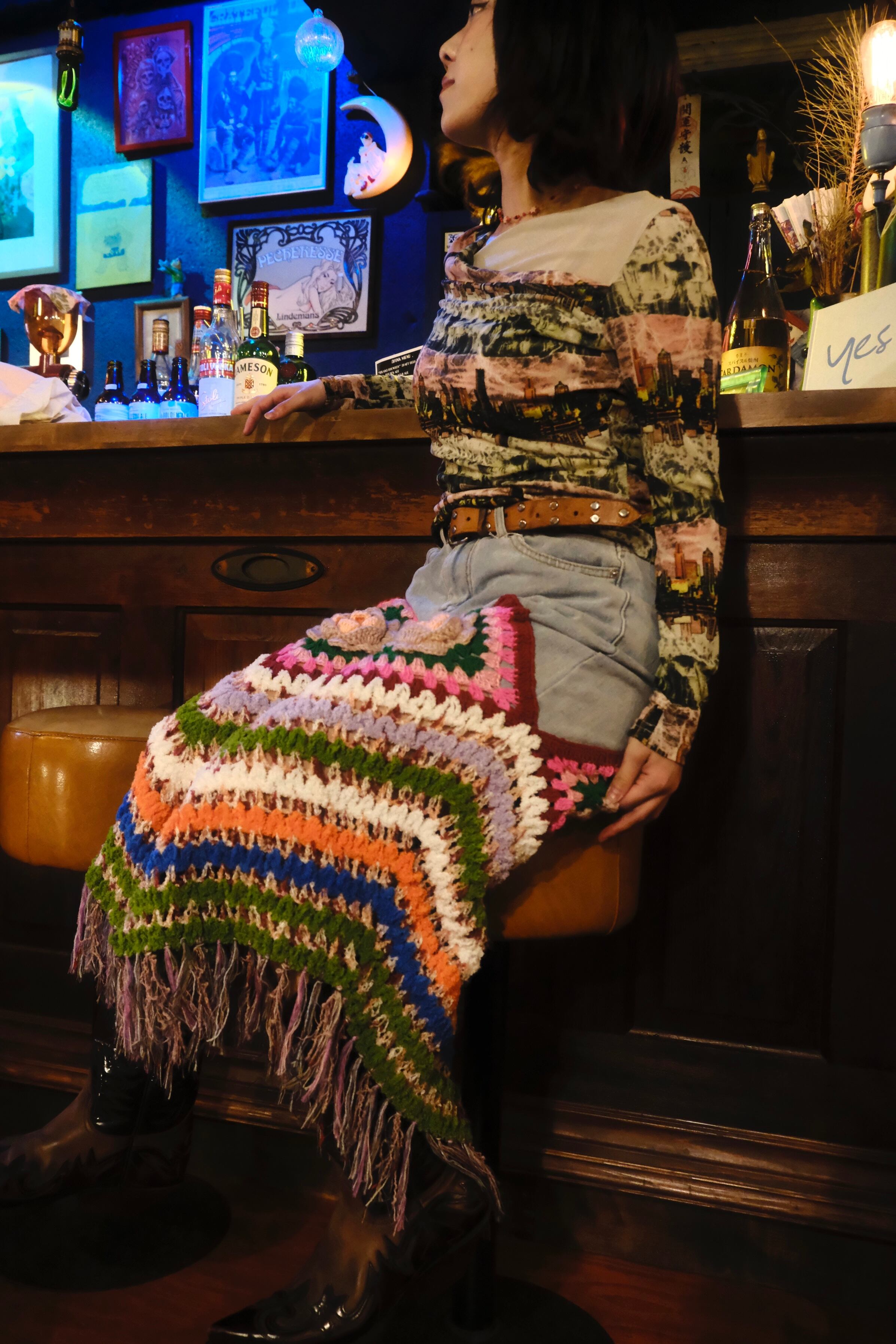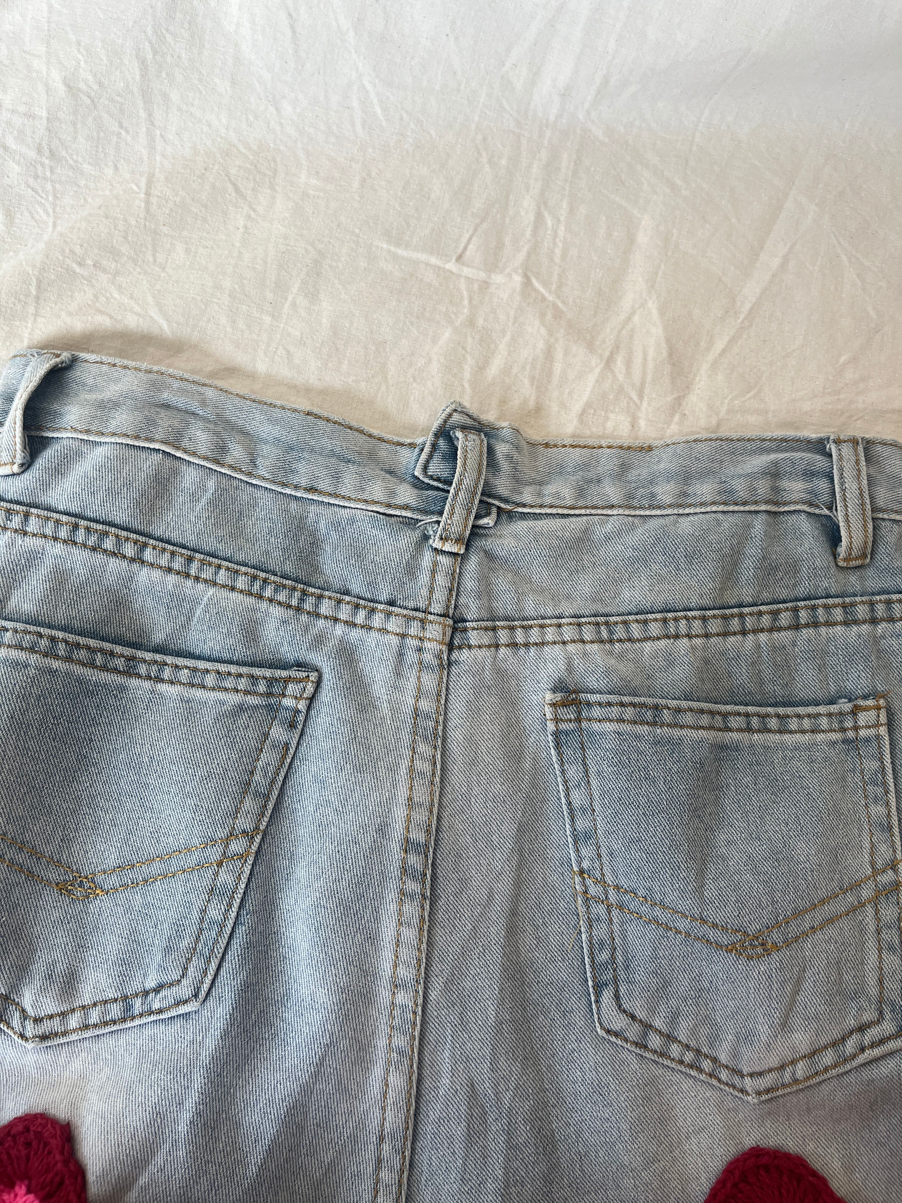 デニムにカラフルなかぎ針編みのニットをドッキングしたリメイクデニムパンツ。
