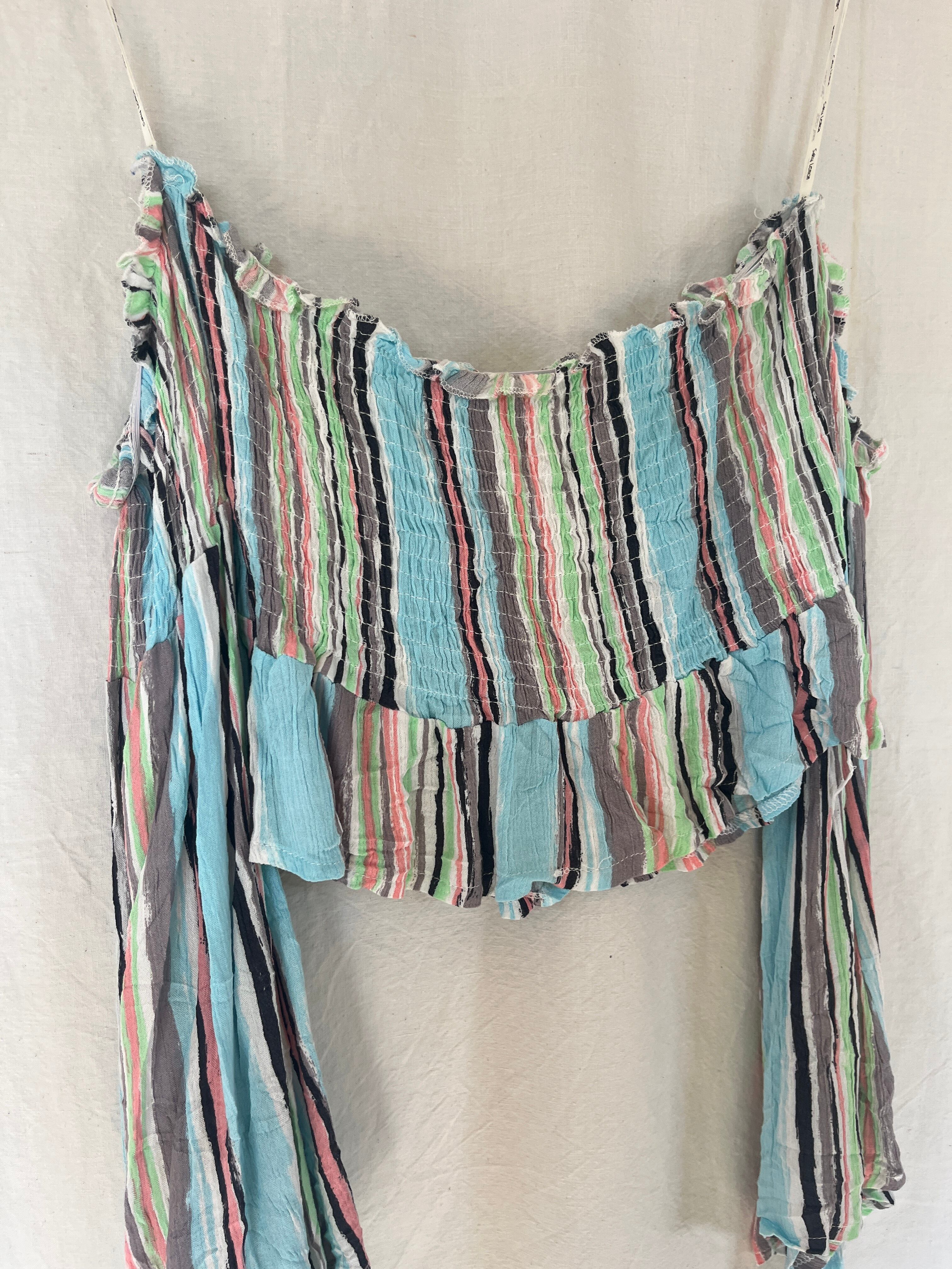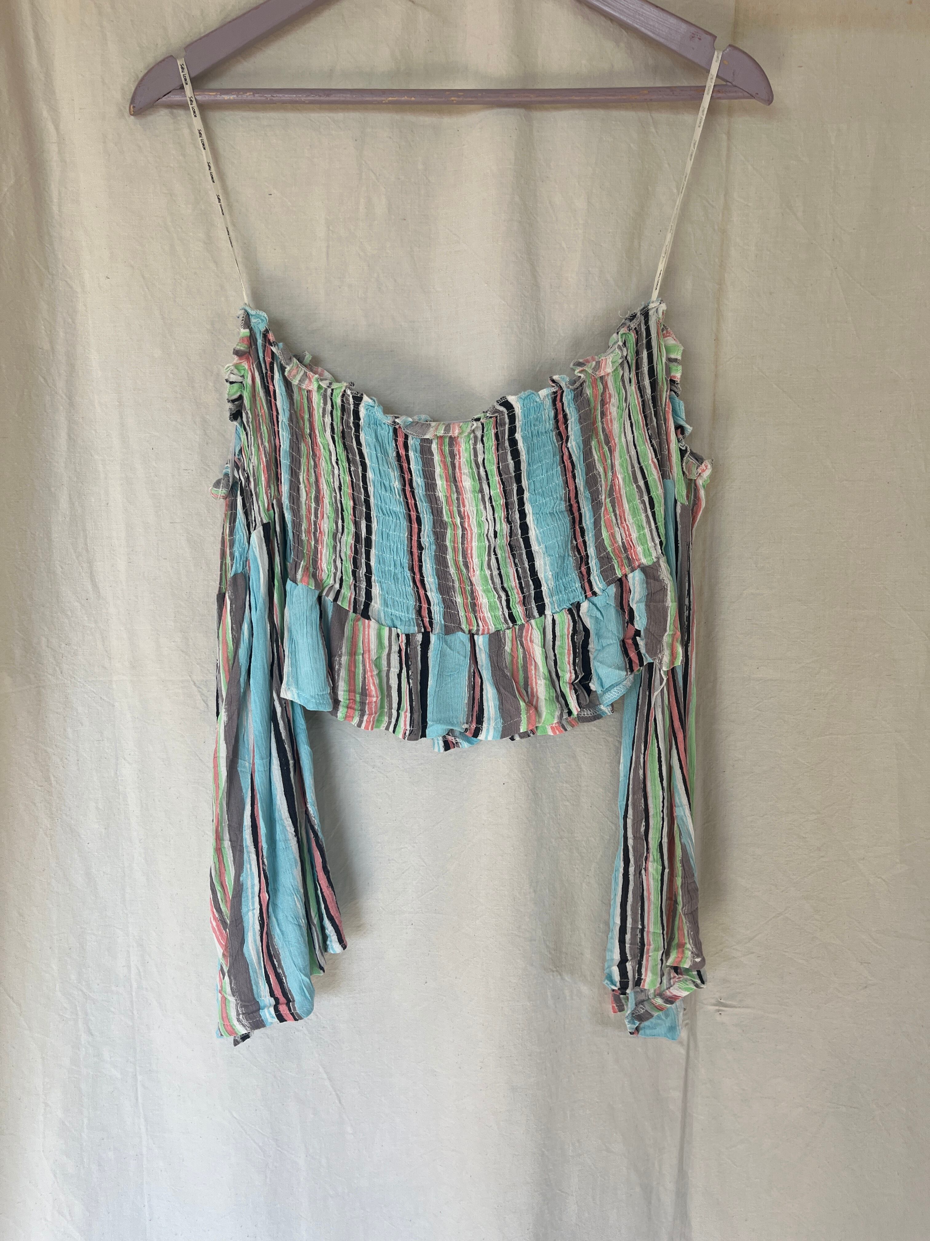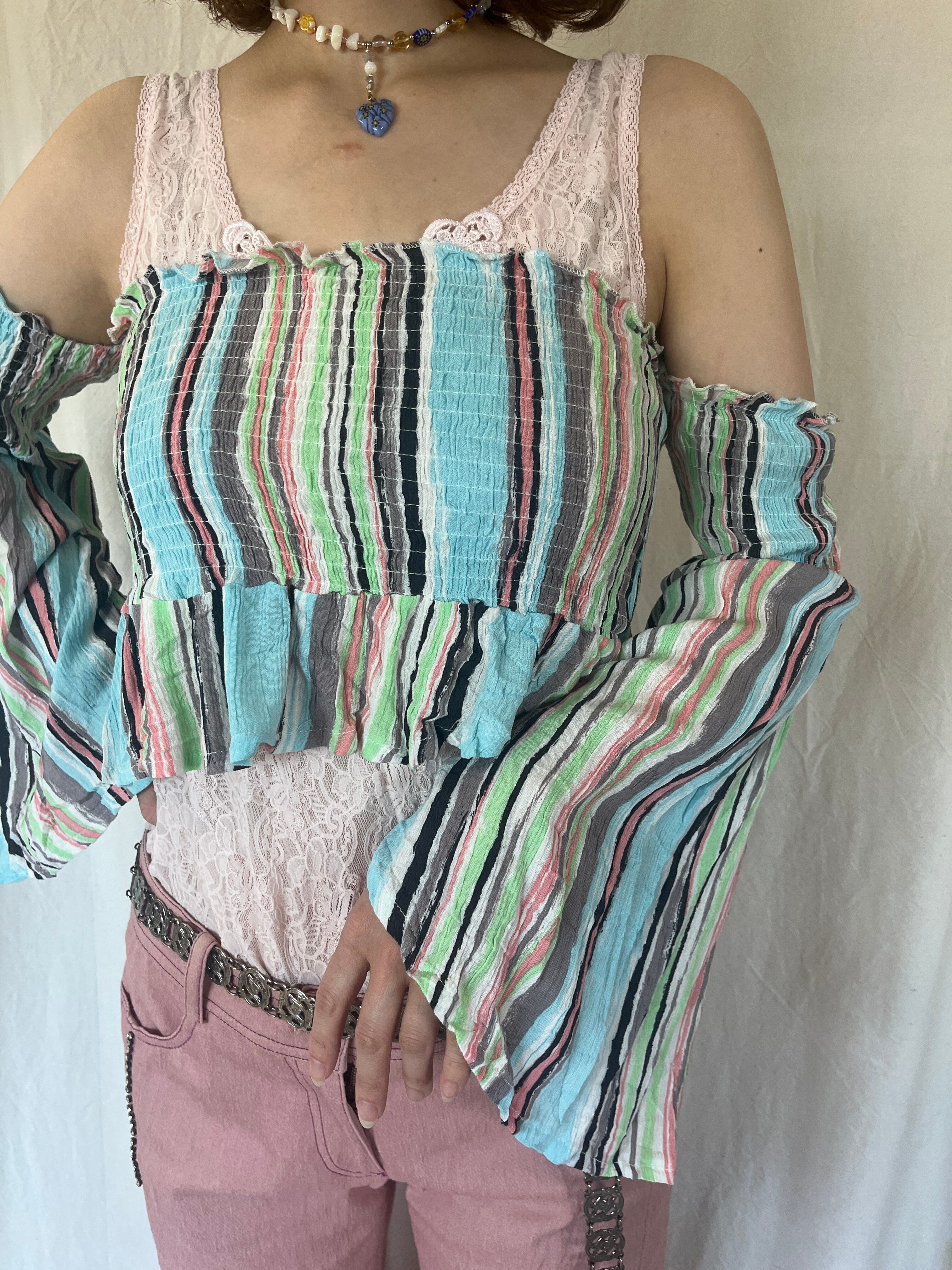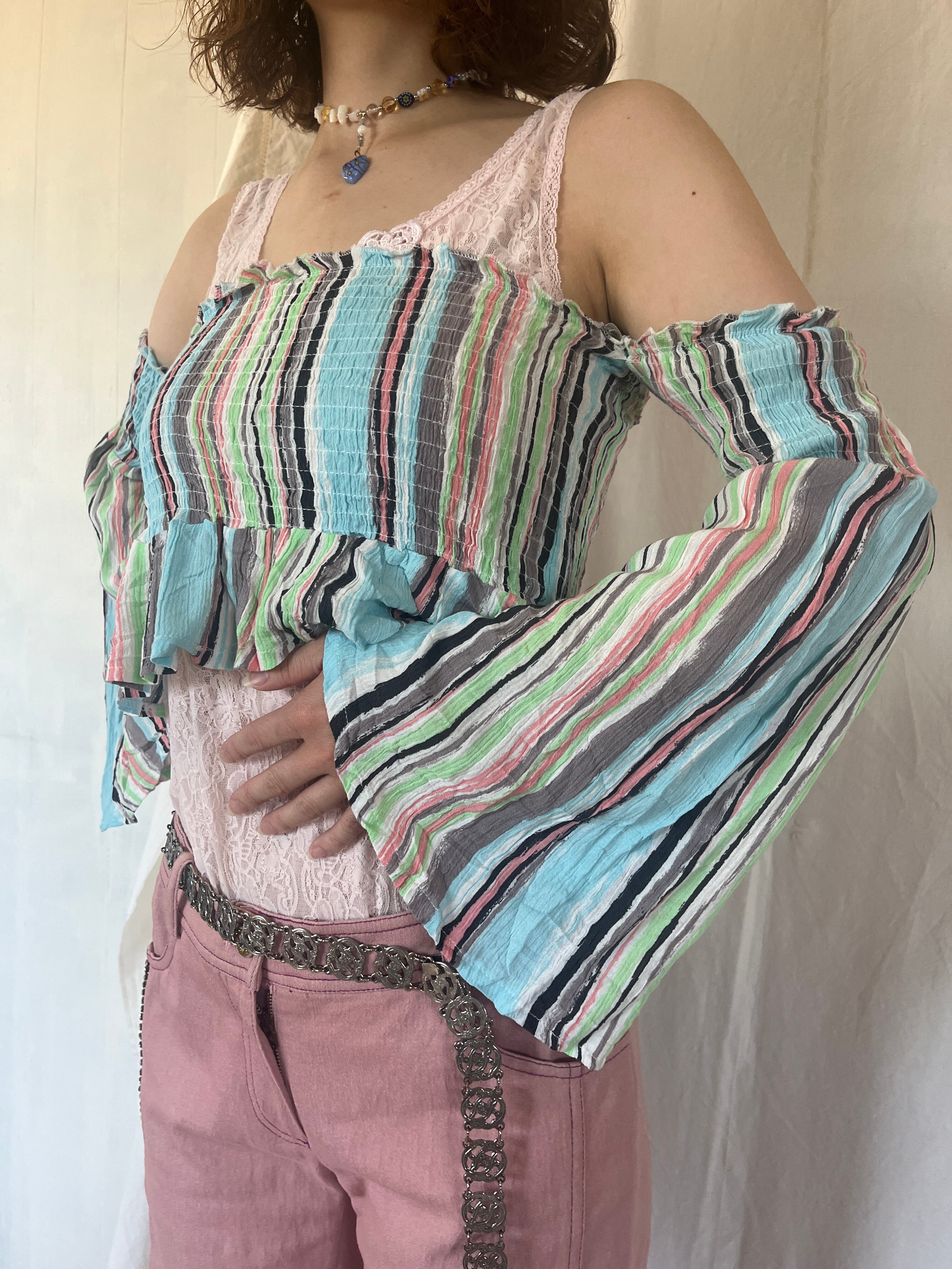 チューブトップにフレアスリーブがついたようなデザインのオフショルダートップス。
