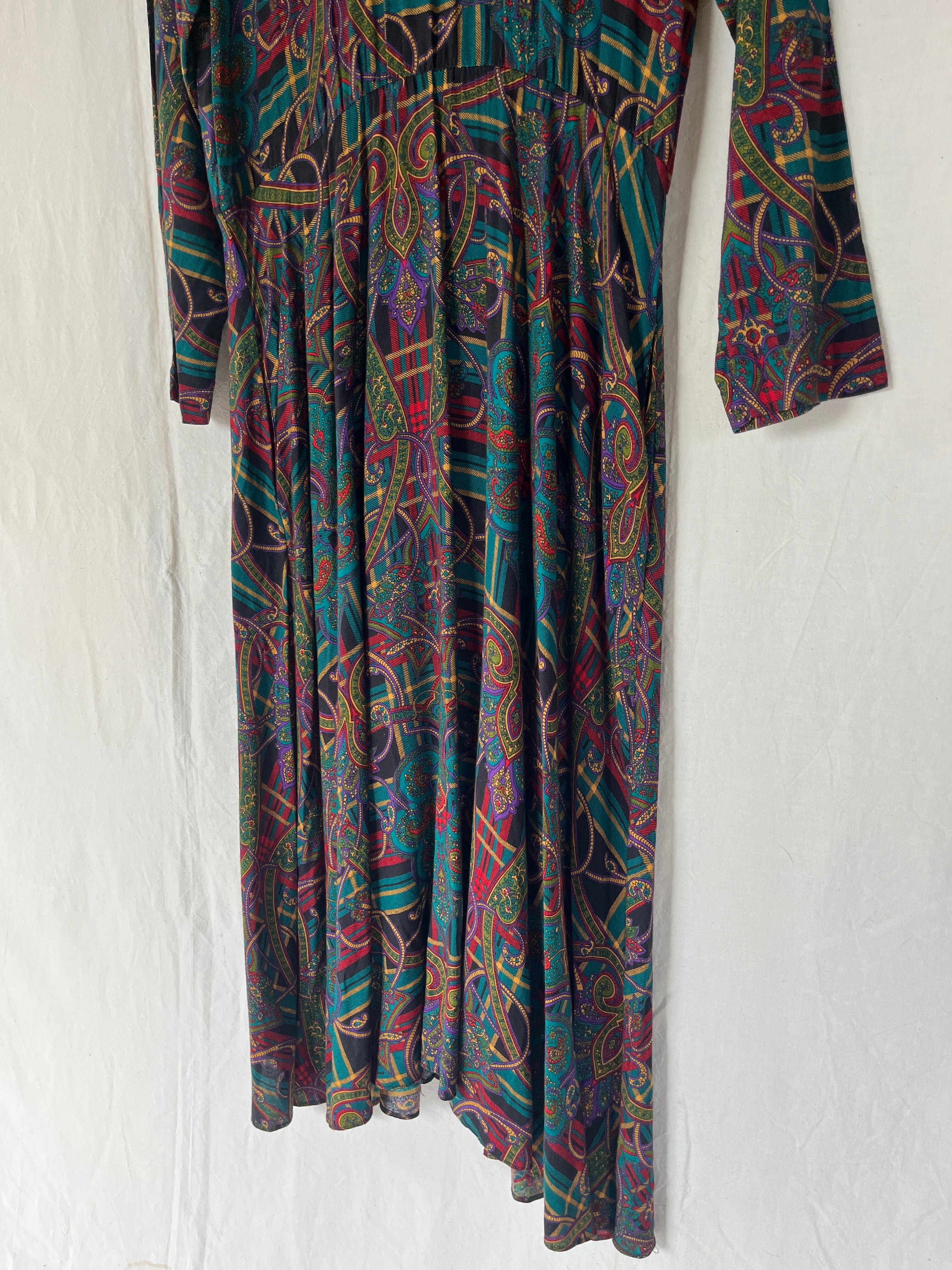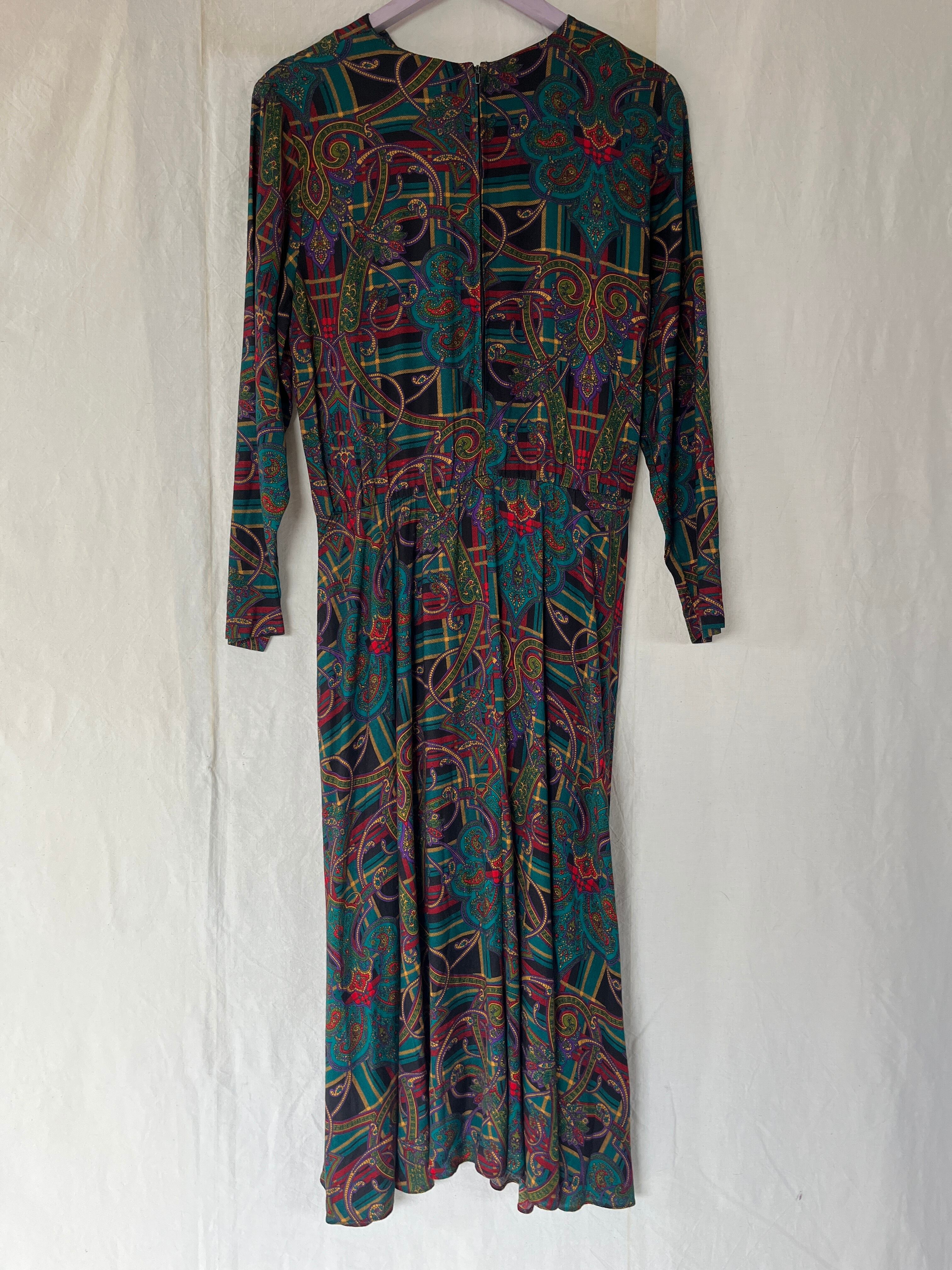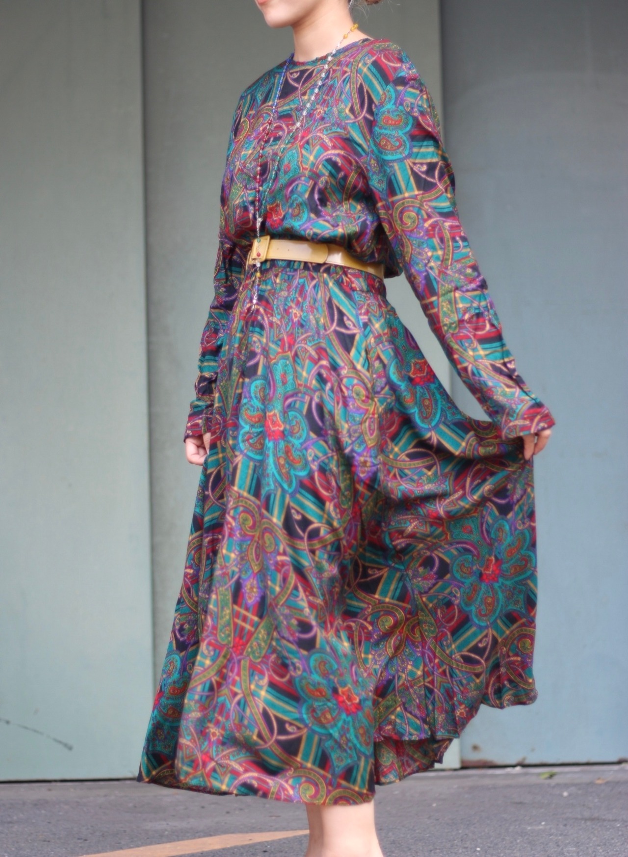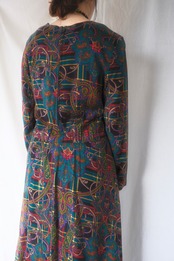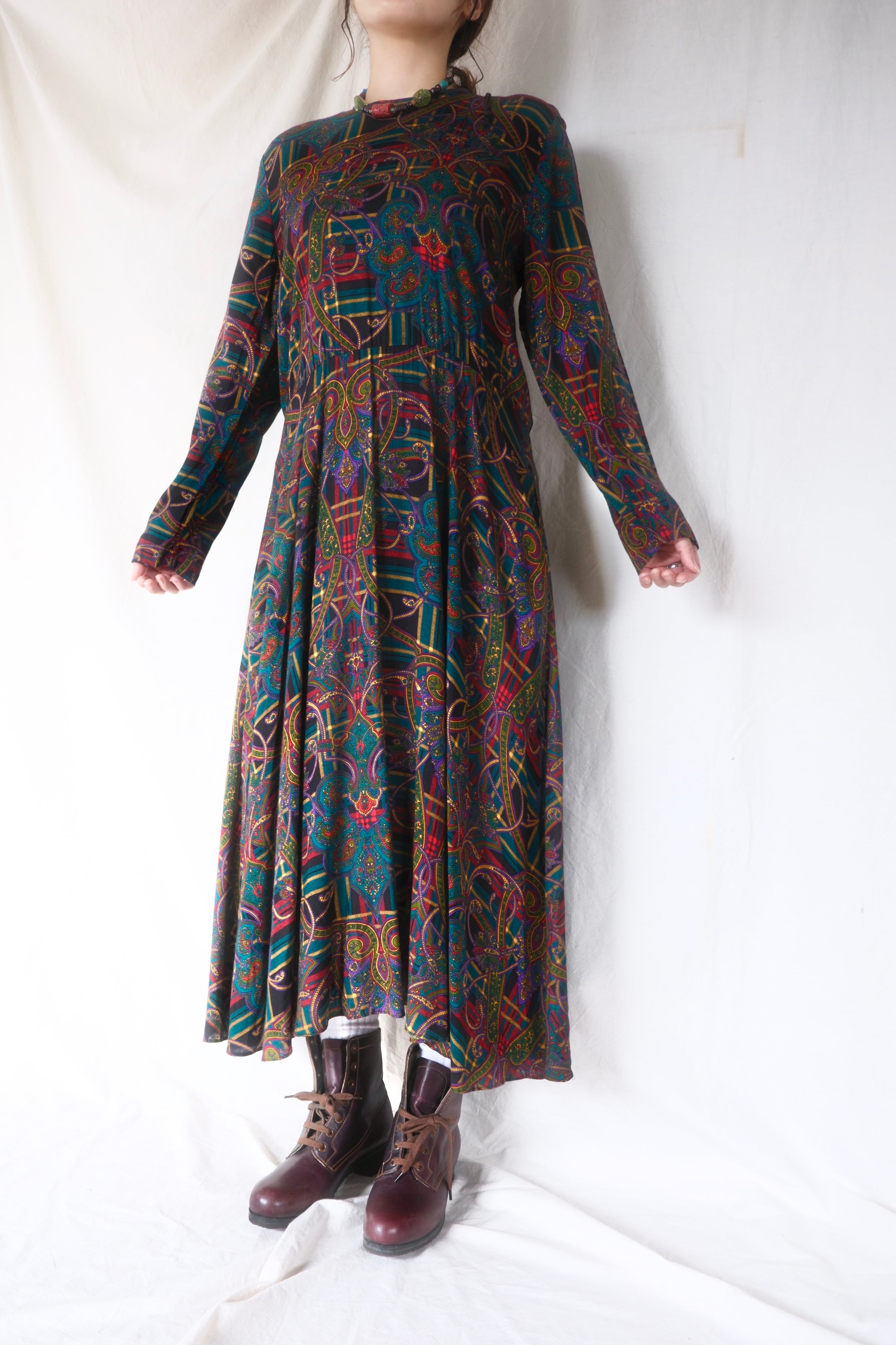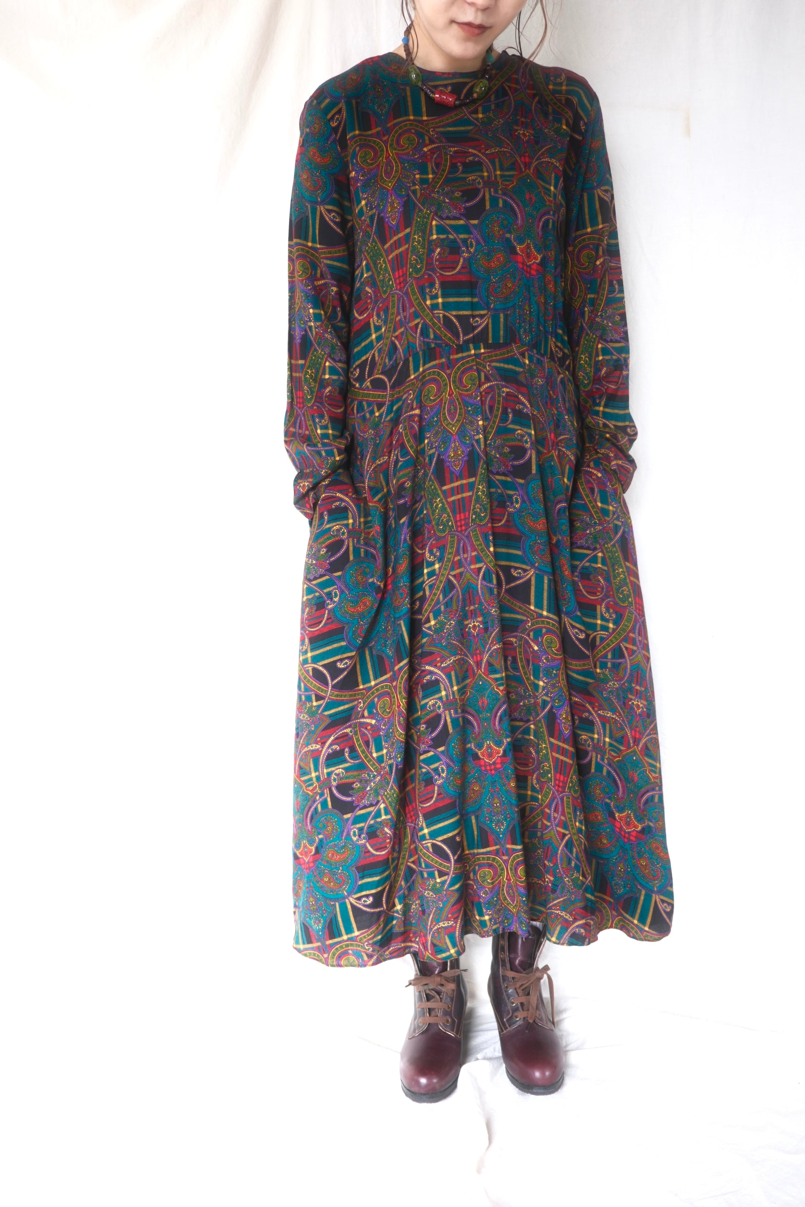 グリーンベースのペイズリー×チェック柄のワンピース。