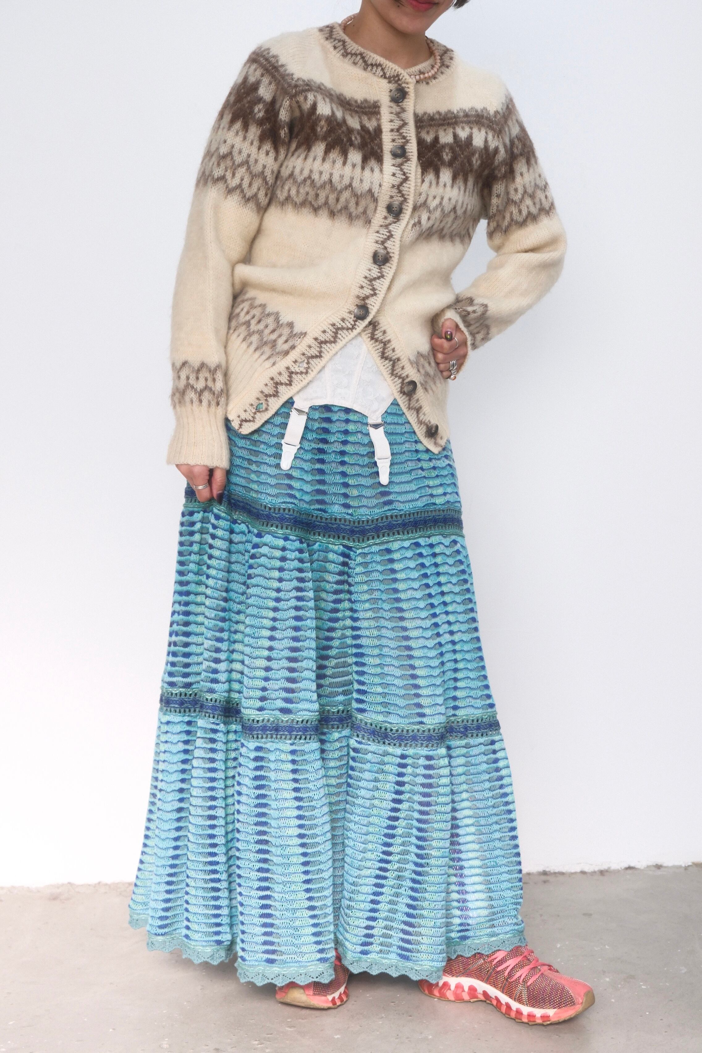鮮やかなターコイズブルーが目を惹くニットスカート。