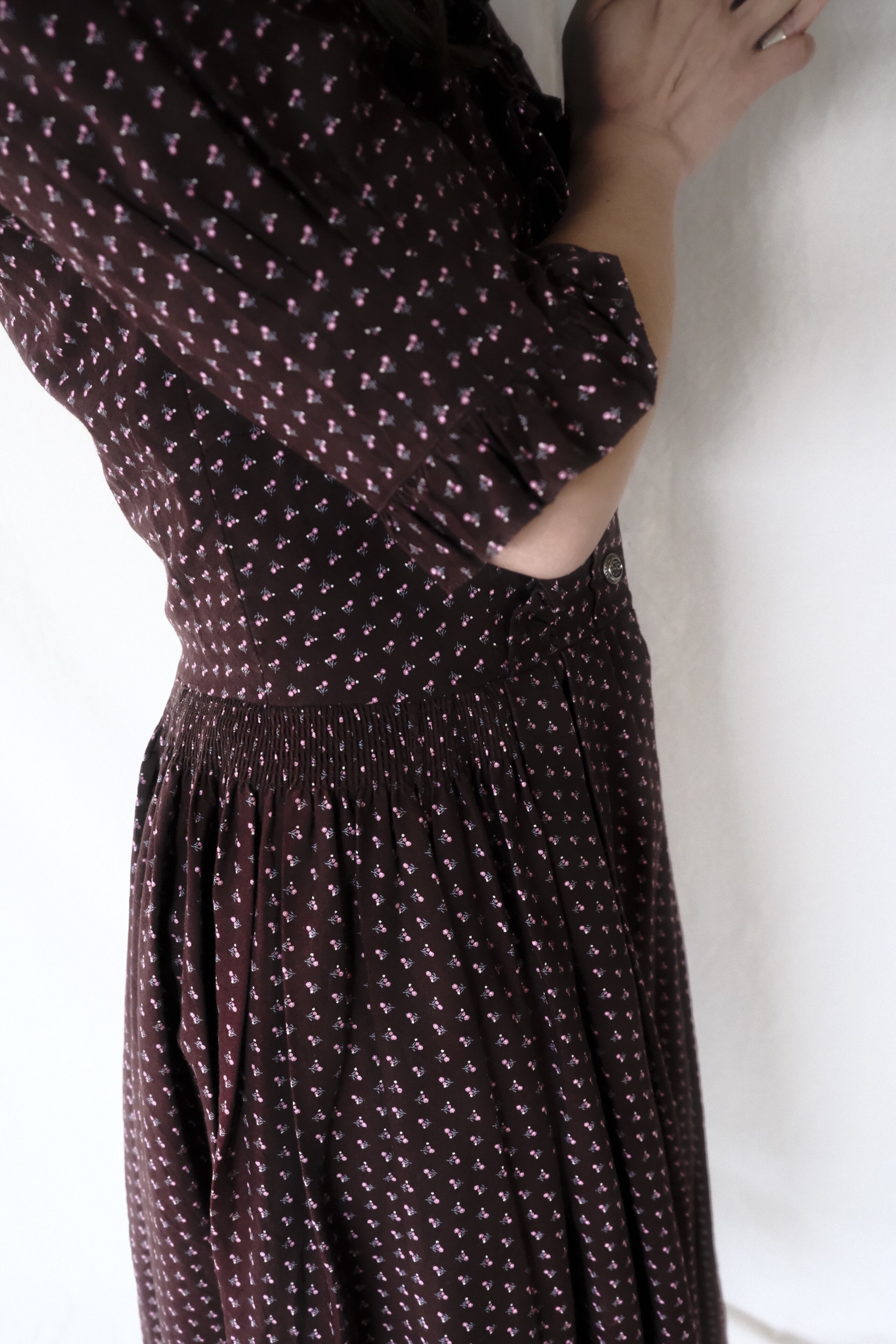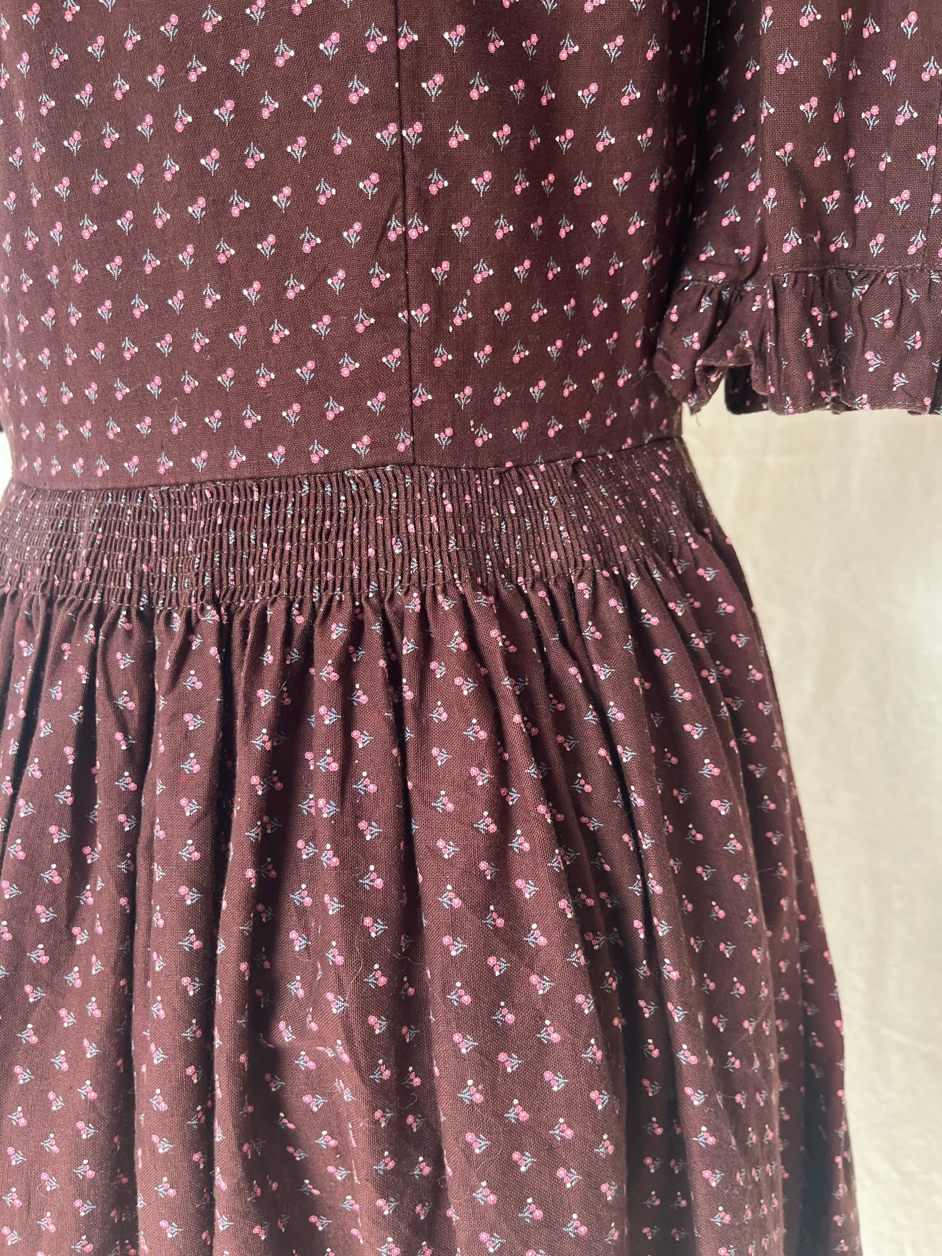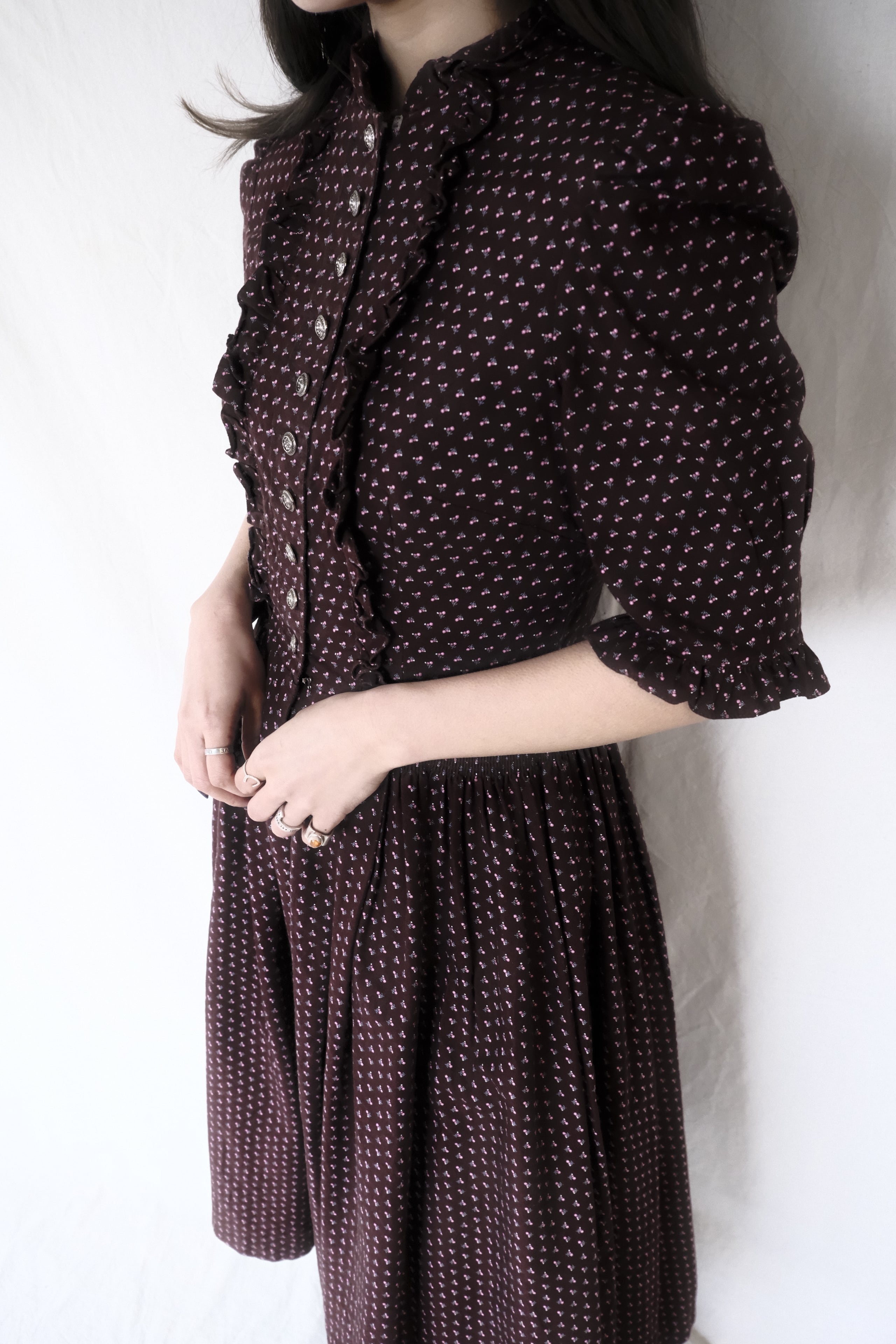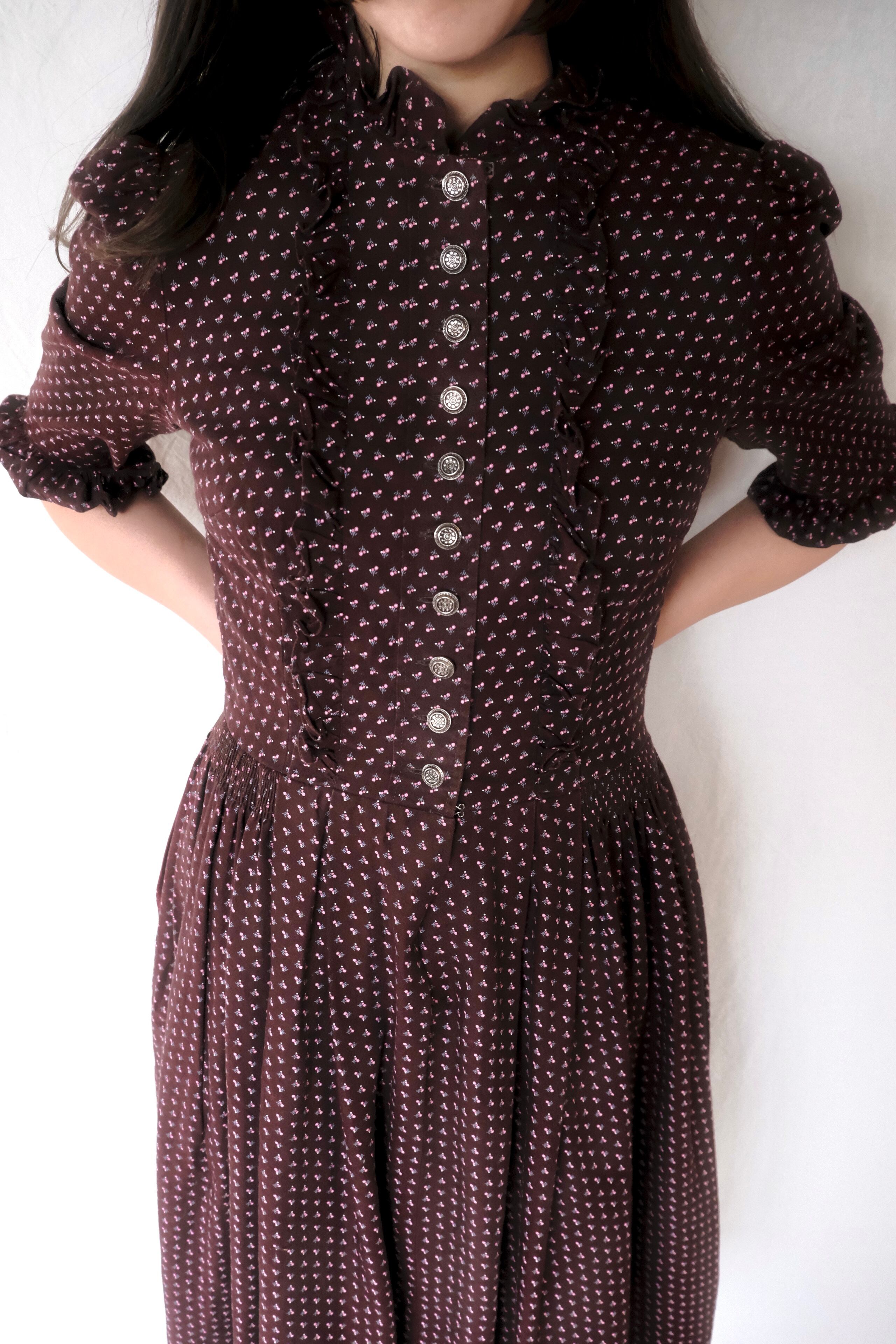 ブラウンにピンクの小花柄でロマンティックな雰囲気たっぷりの一着。