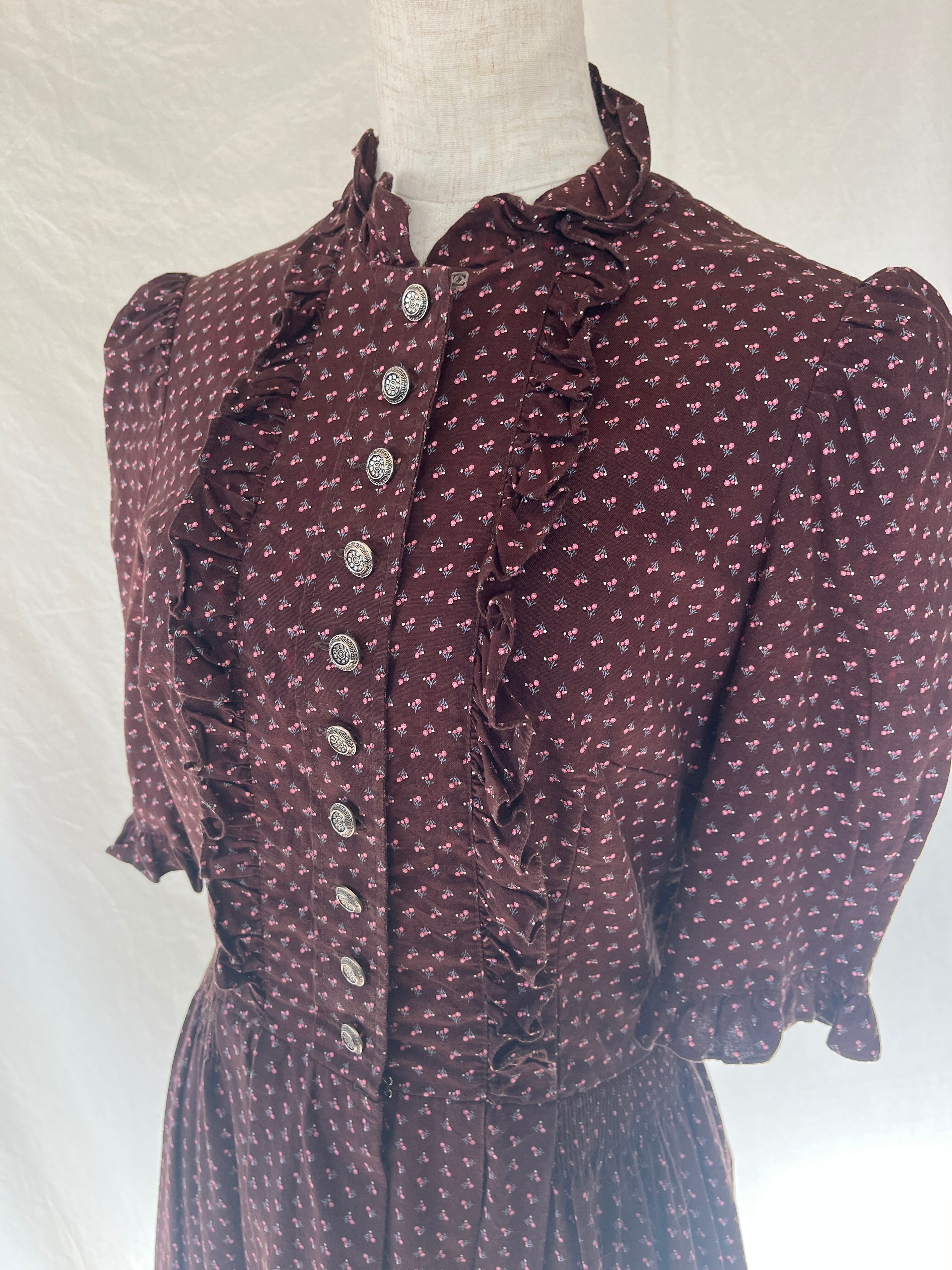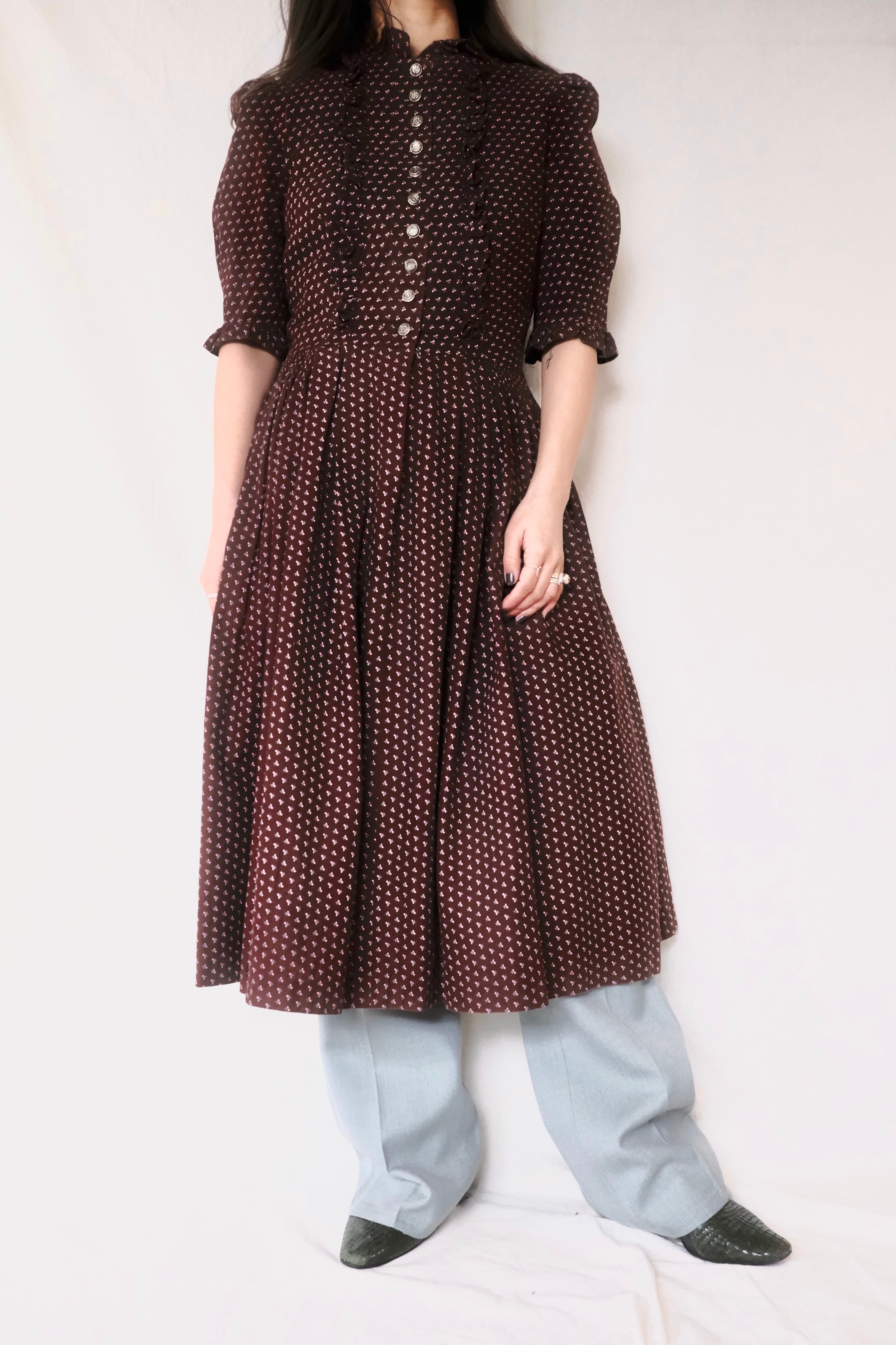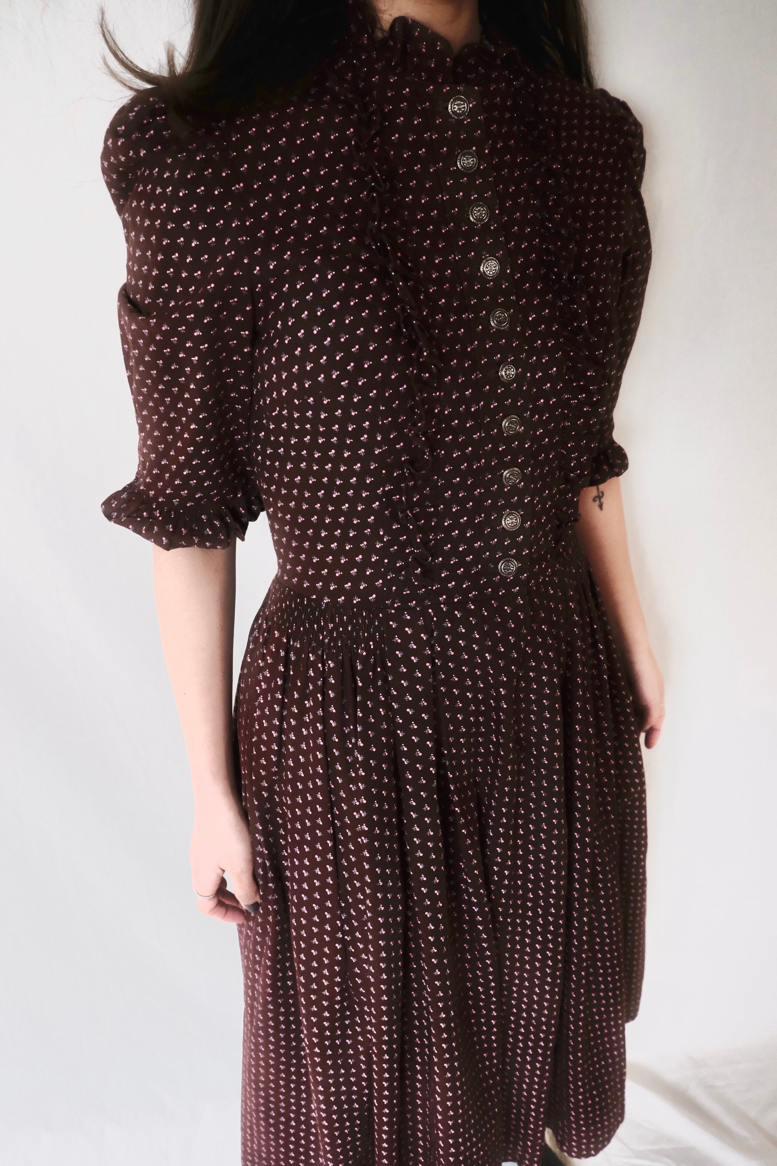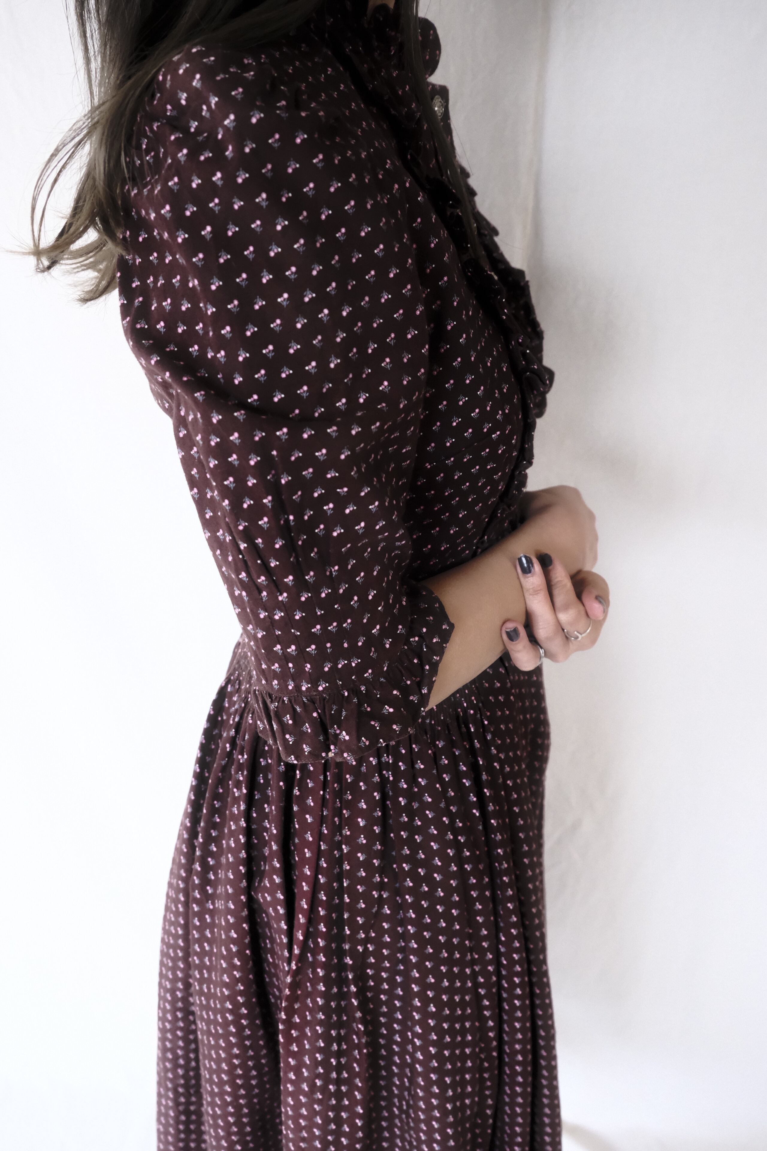 ブラウンにピンクの小花柄でロマンティックな雰囲気たっぷりの一着。
