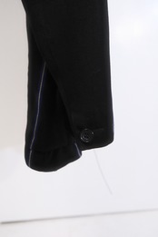 段返りの3つボタンで古い洋服のパターンの特徴である斜めの前端に合わせて地の目をとっているので裾にかけて脇側に逃げていくエレガントなジャケットです。