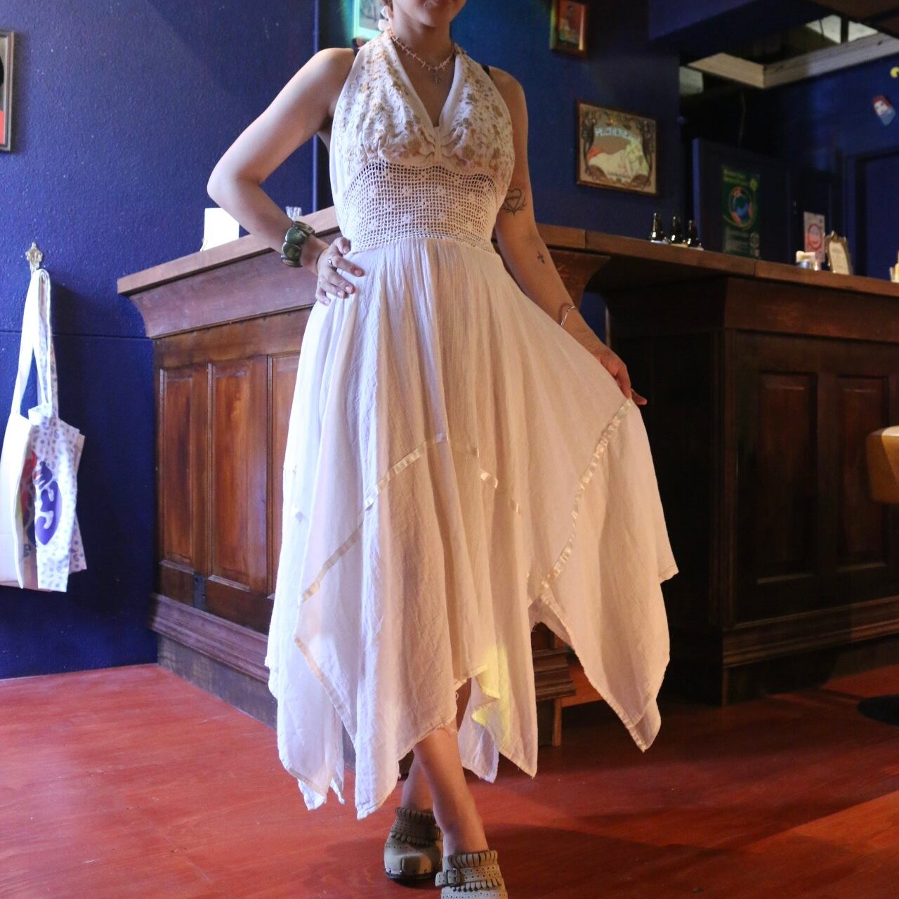 胸元の刺繍が可愛いホルターネックのワンピース。