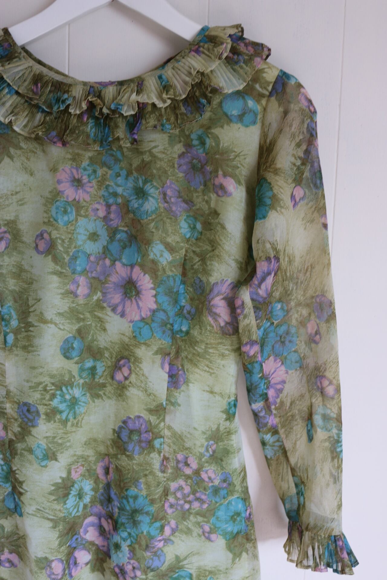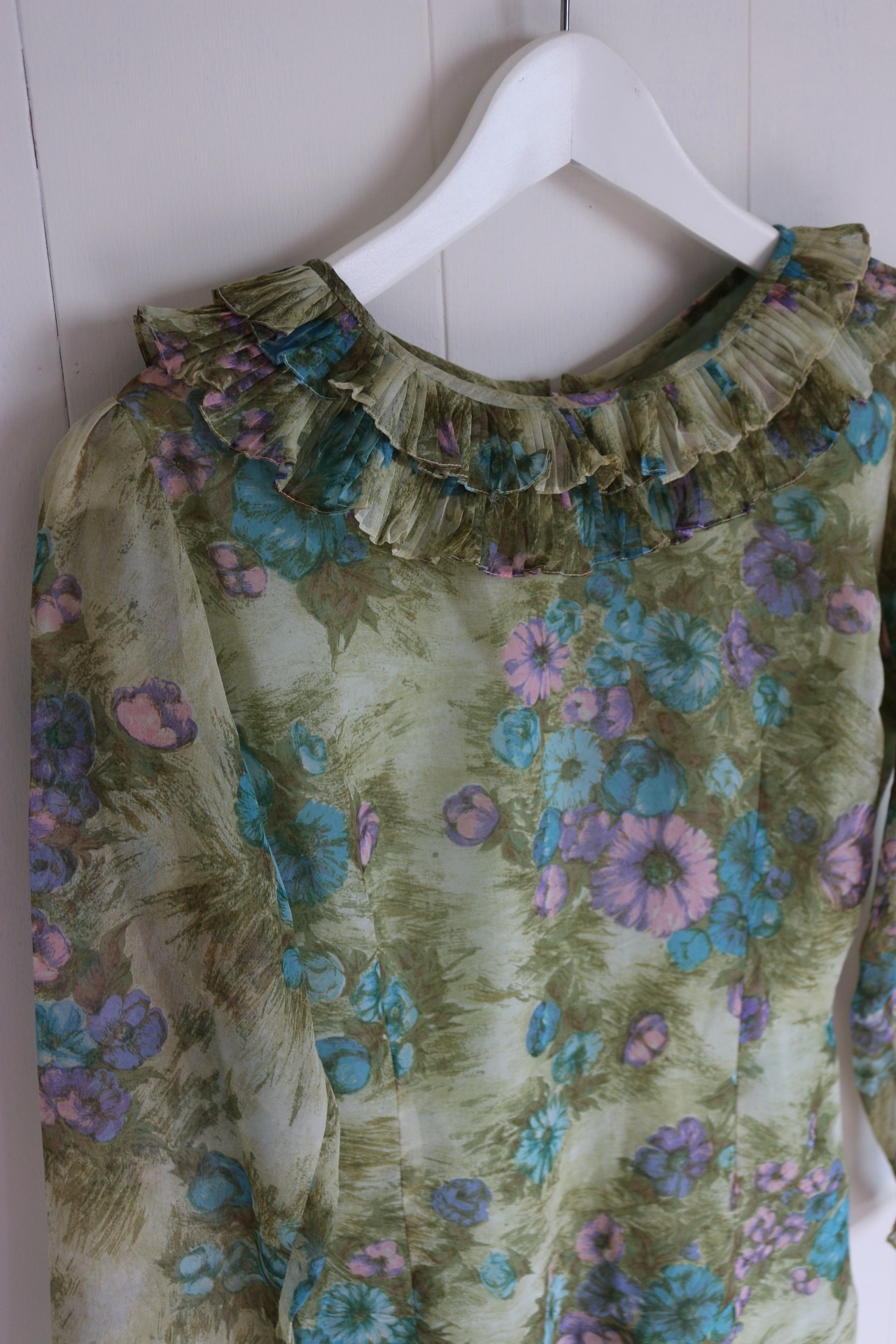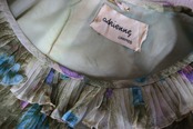 ライトグリーンの優しい色味と華やかなな花柄が素敵なドレス。