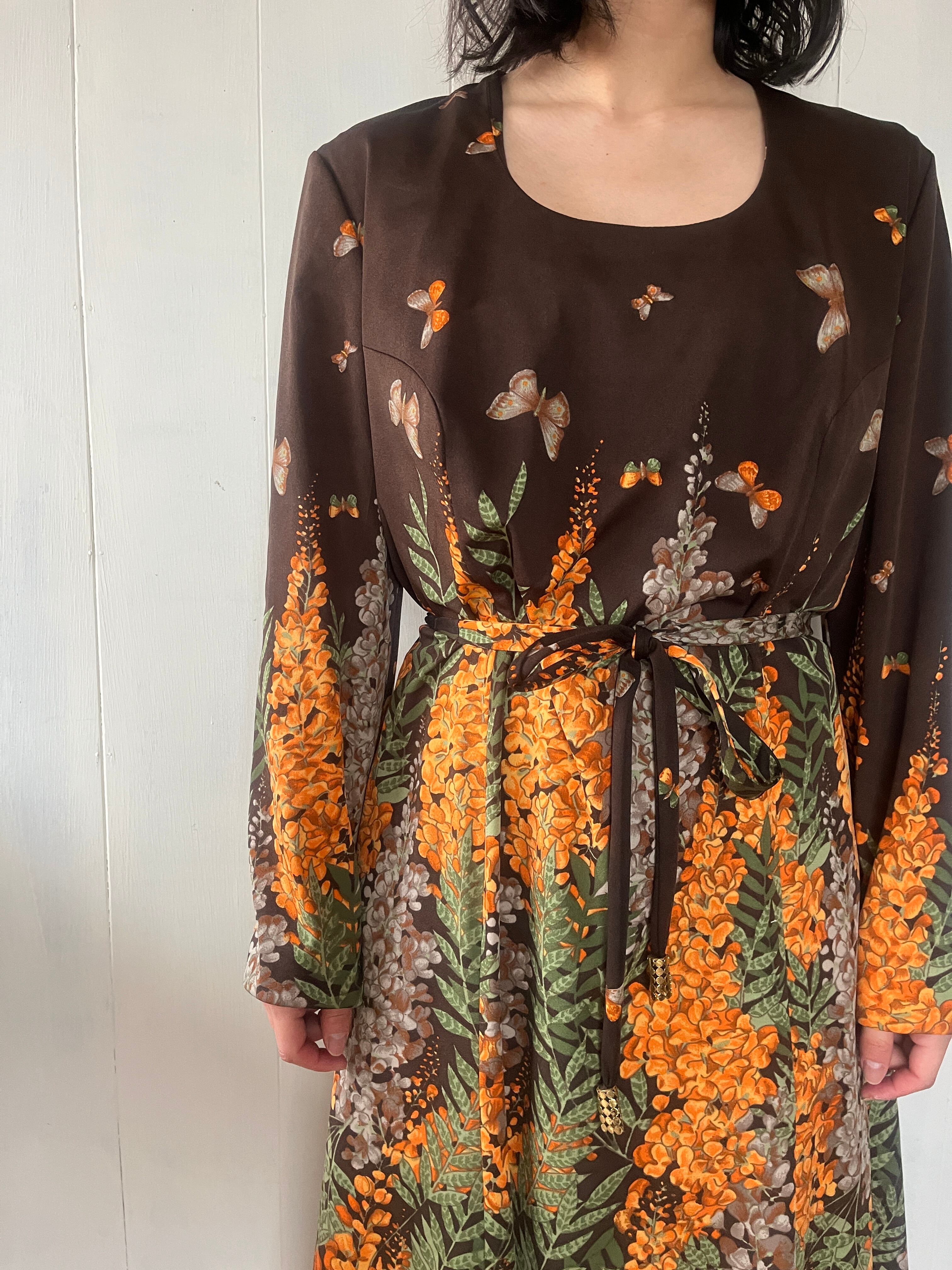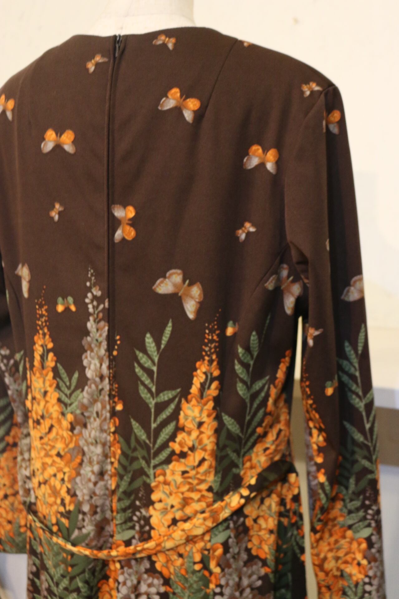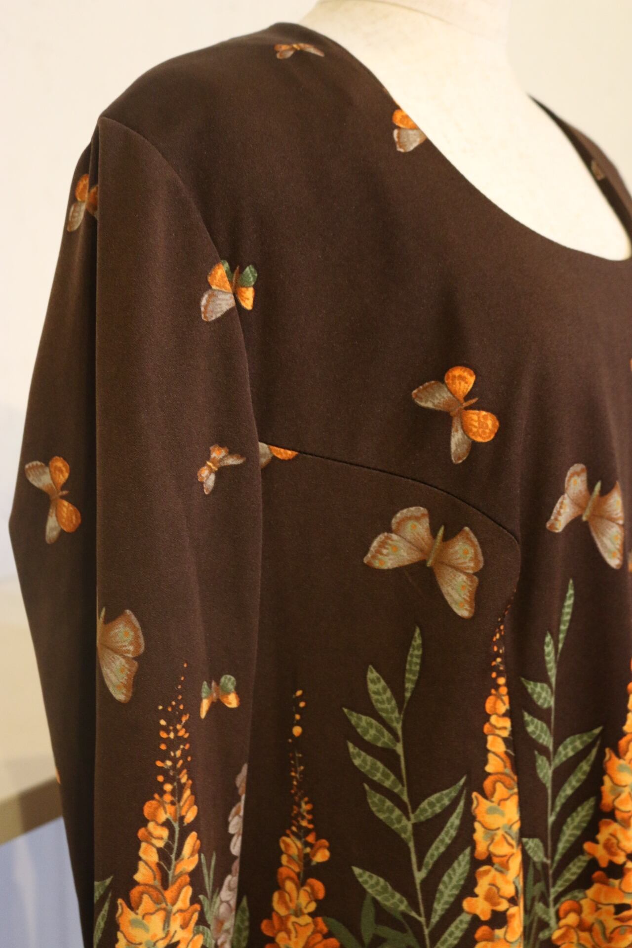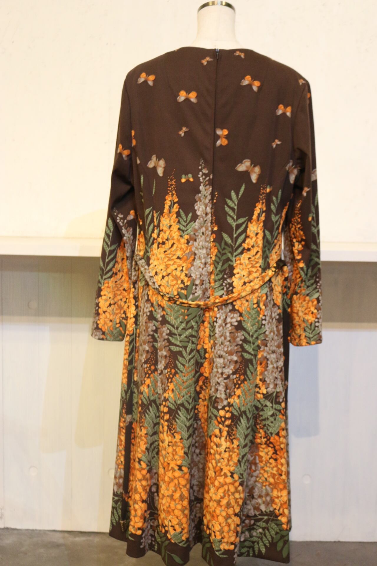 お花の上を蝶が飛び交うデザインが素敵なワンピースです。