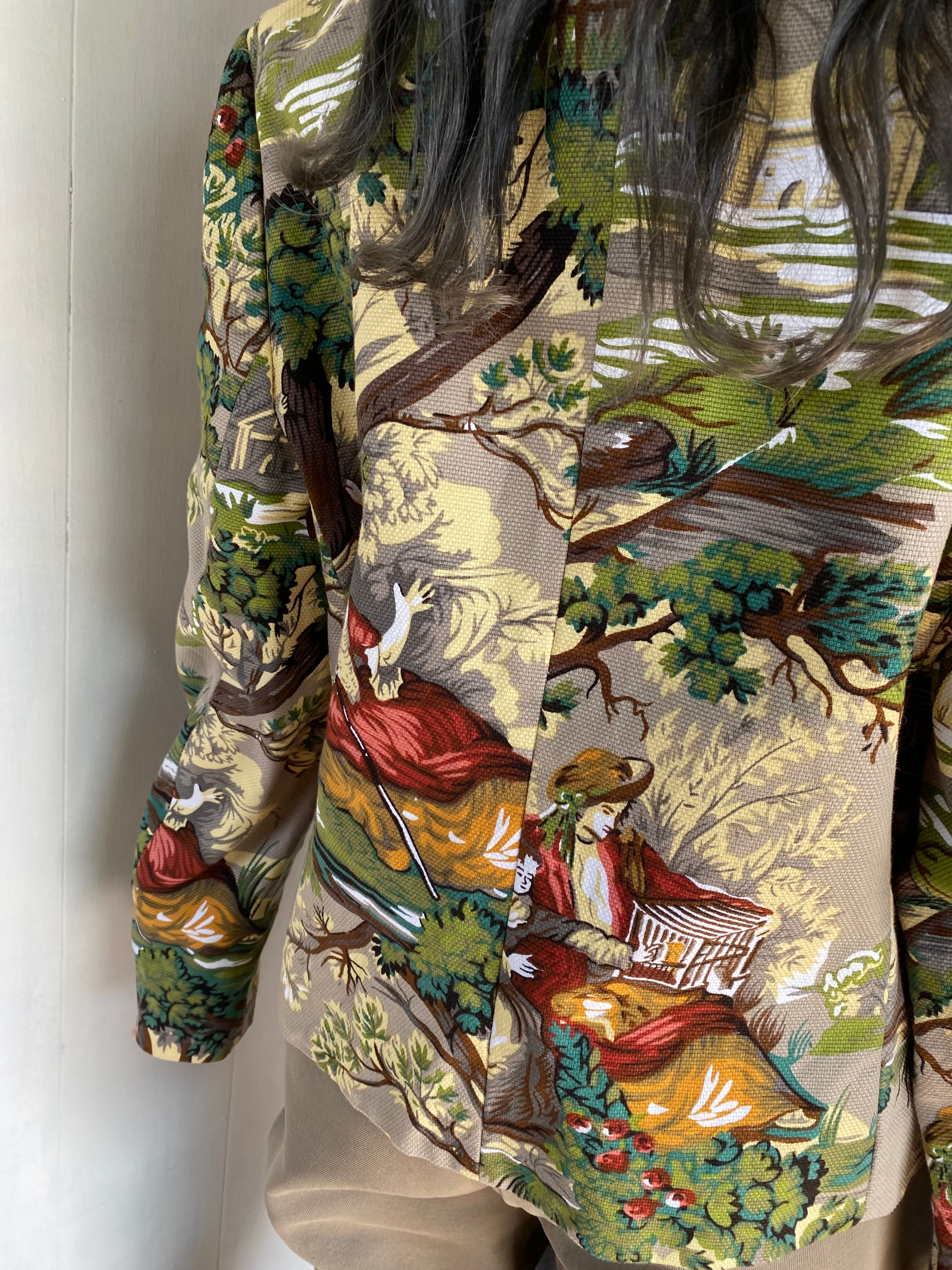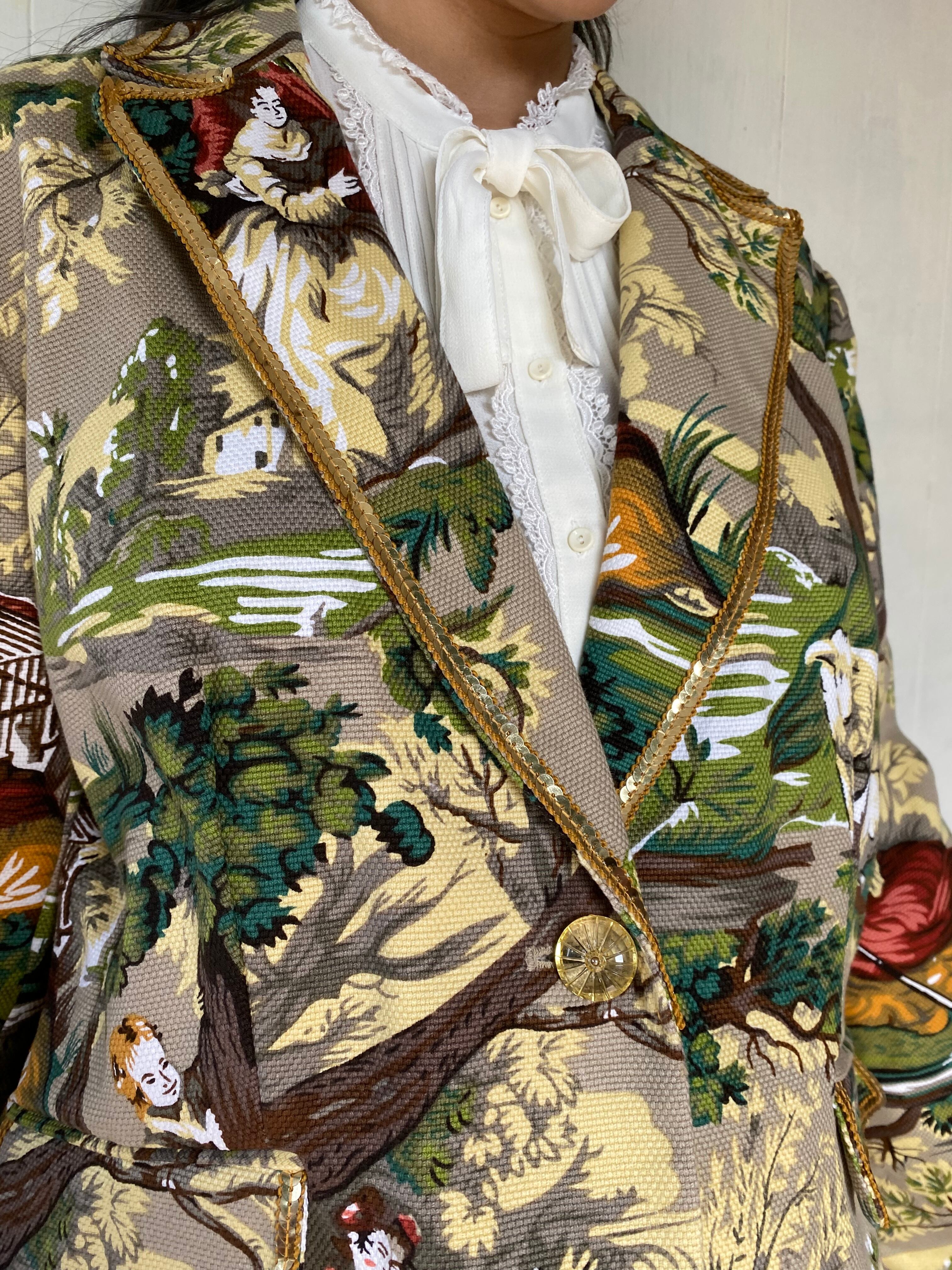 トワル柄の様な風景画プリントが目を惹くジャケット。