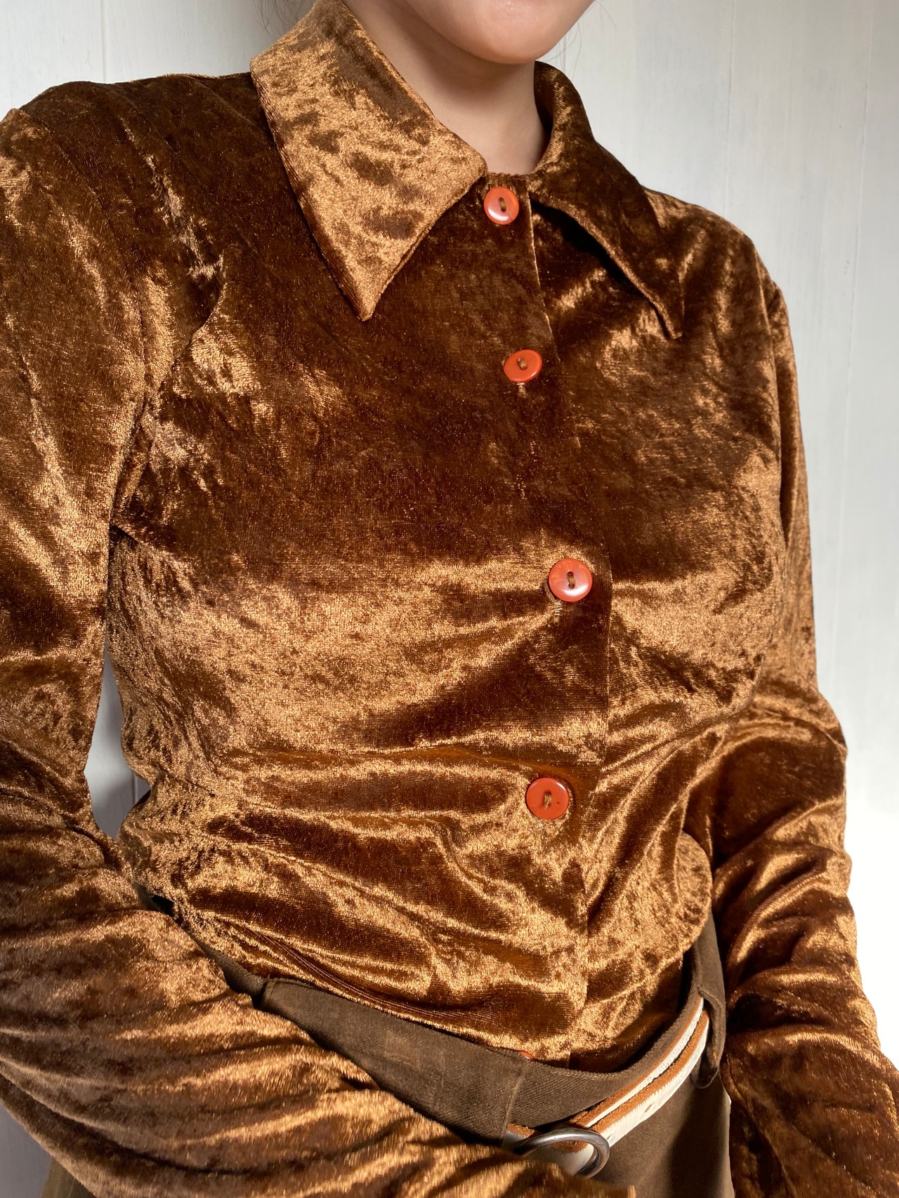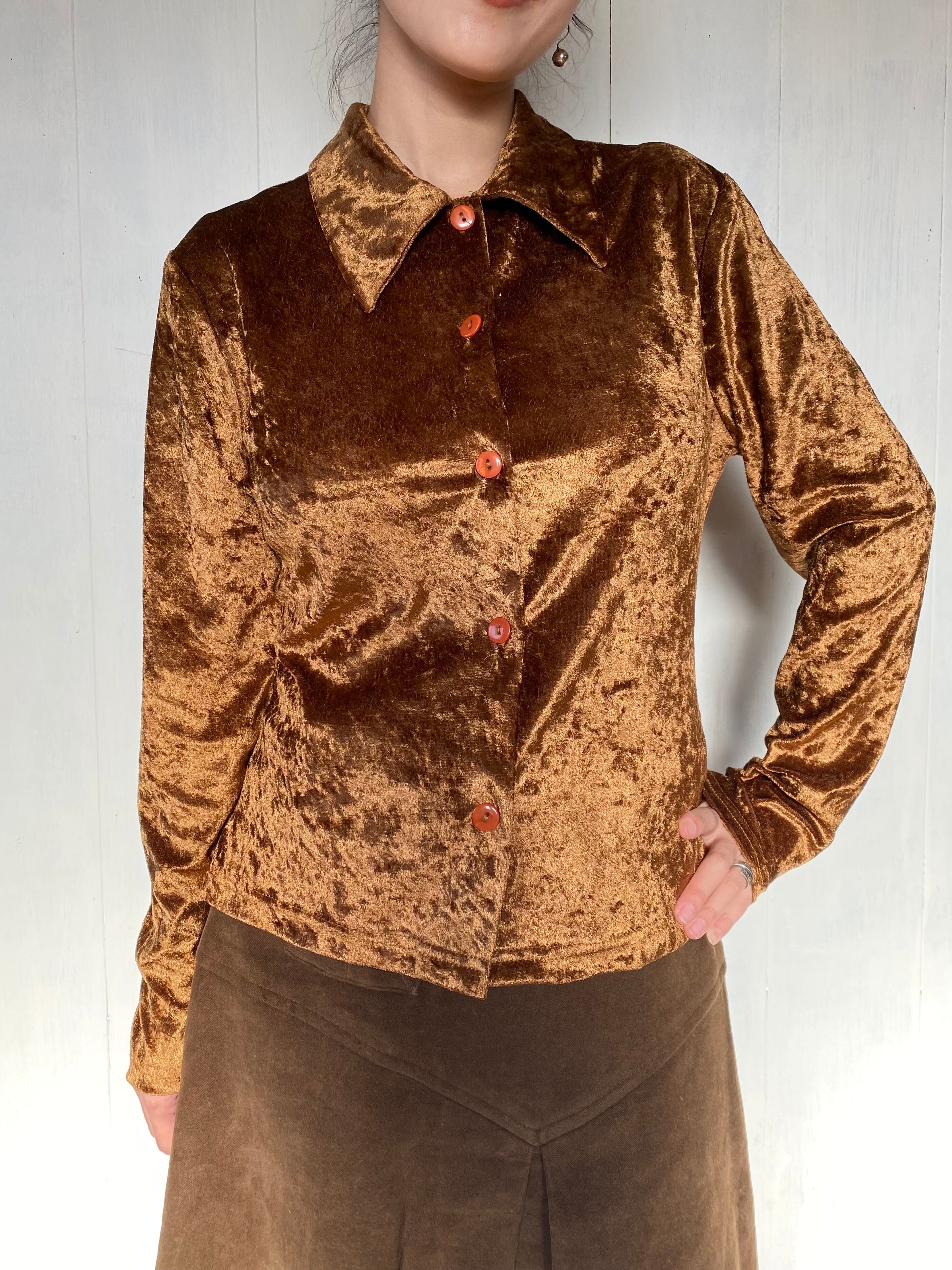 ブラウンのベロアシャツは、ベロア特有の光沢感ととろみ感が素敵です。