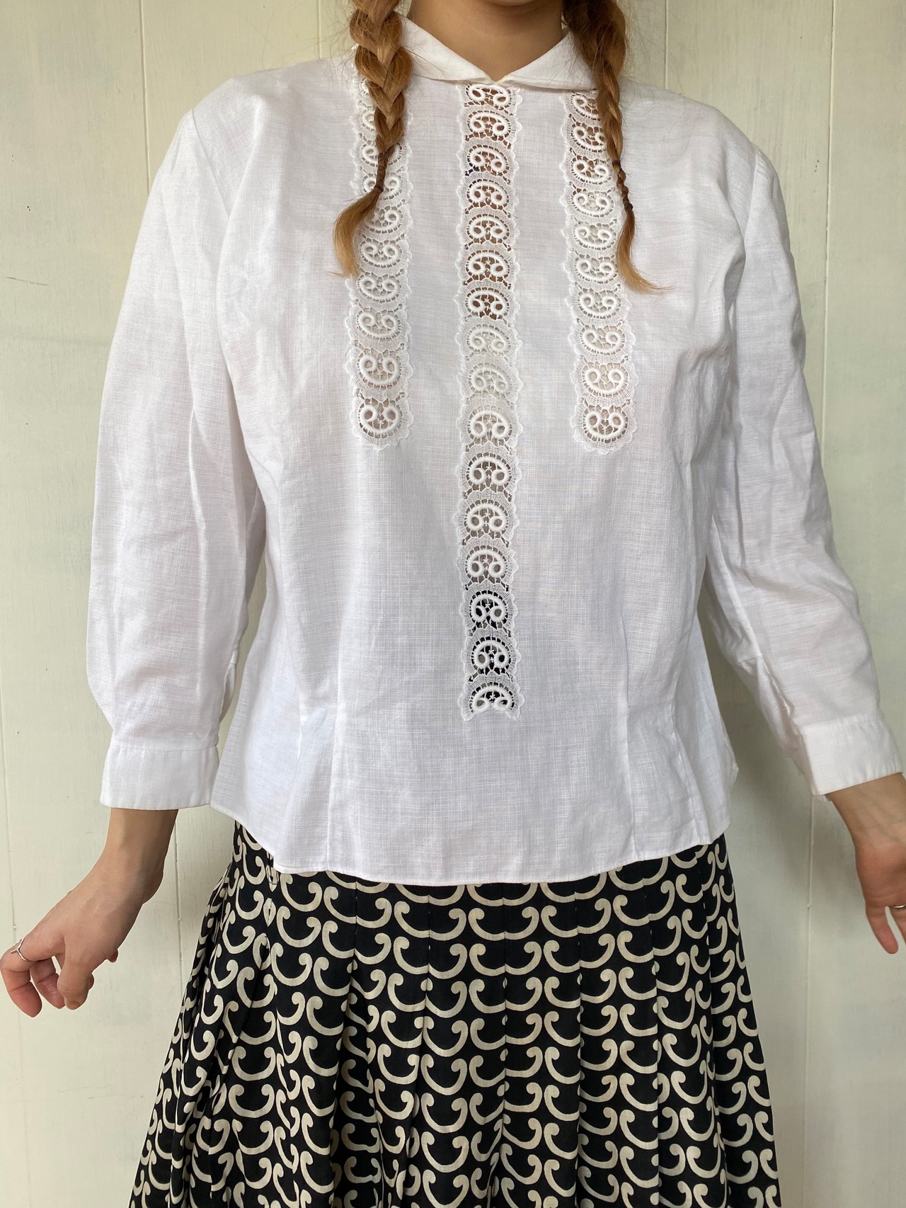 さわやかな真っ白のバックボタンブラウス。