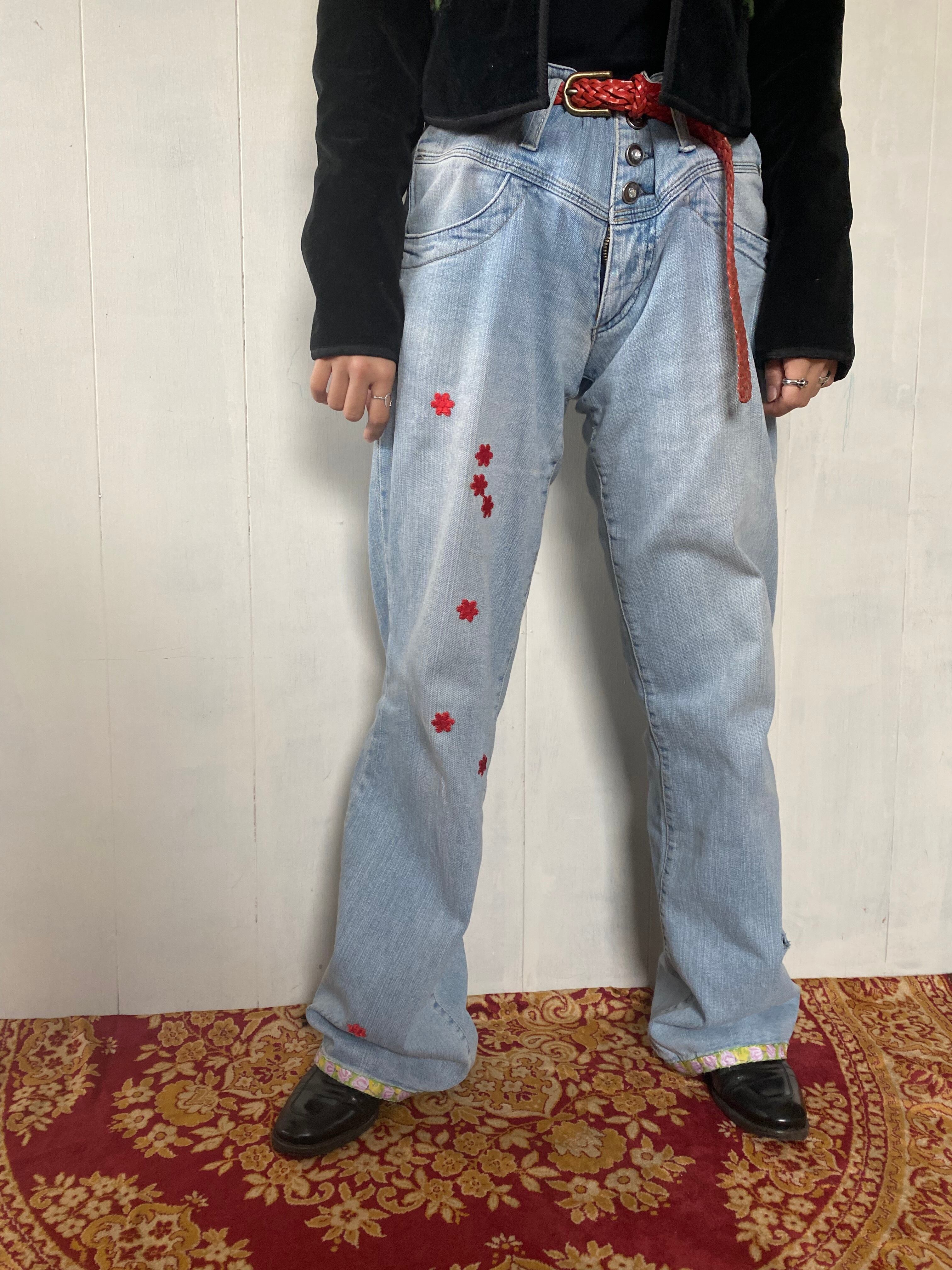 片足にお花が散りばめられたカスタムデニムパンツ。