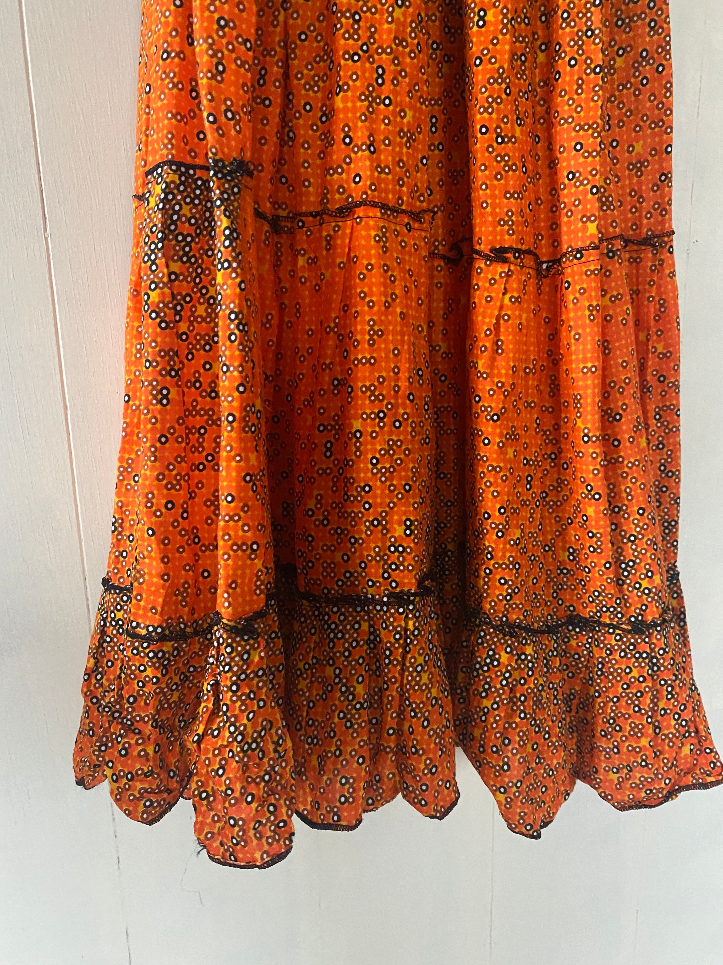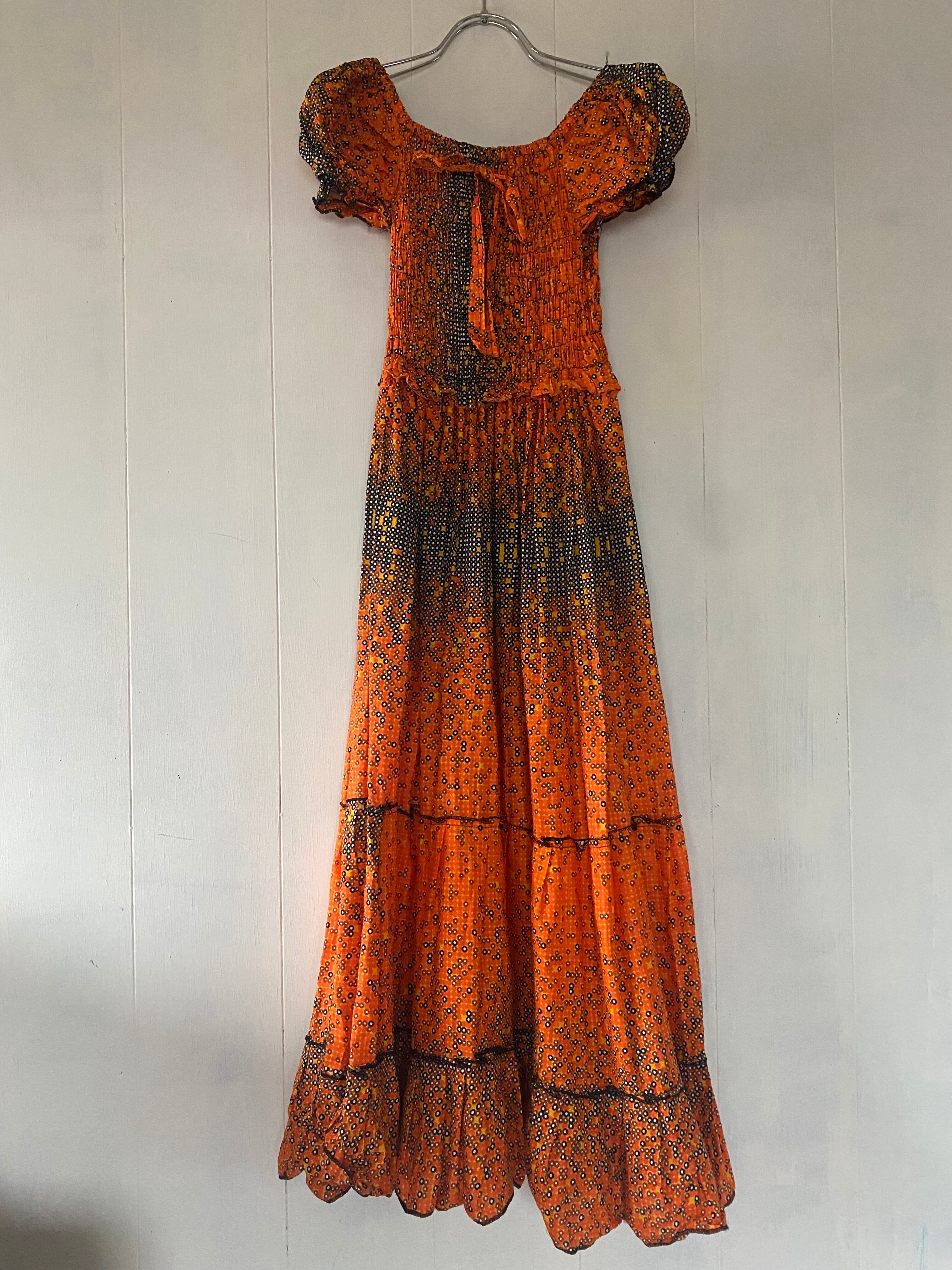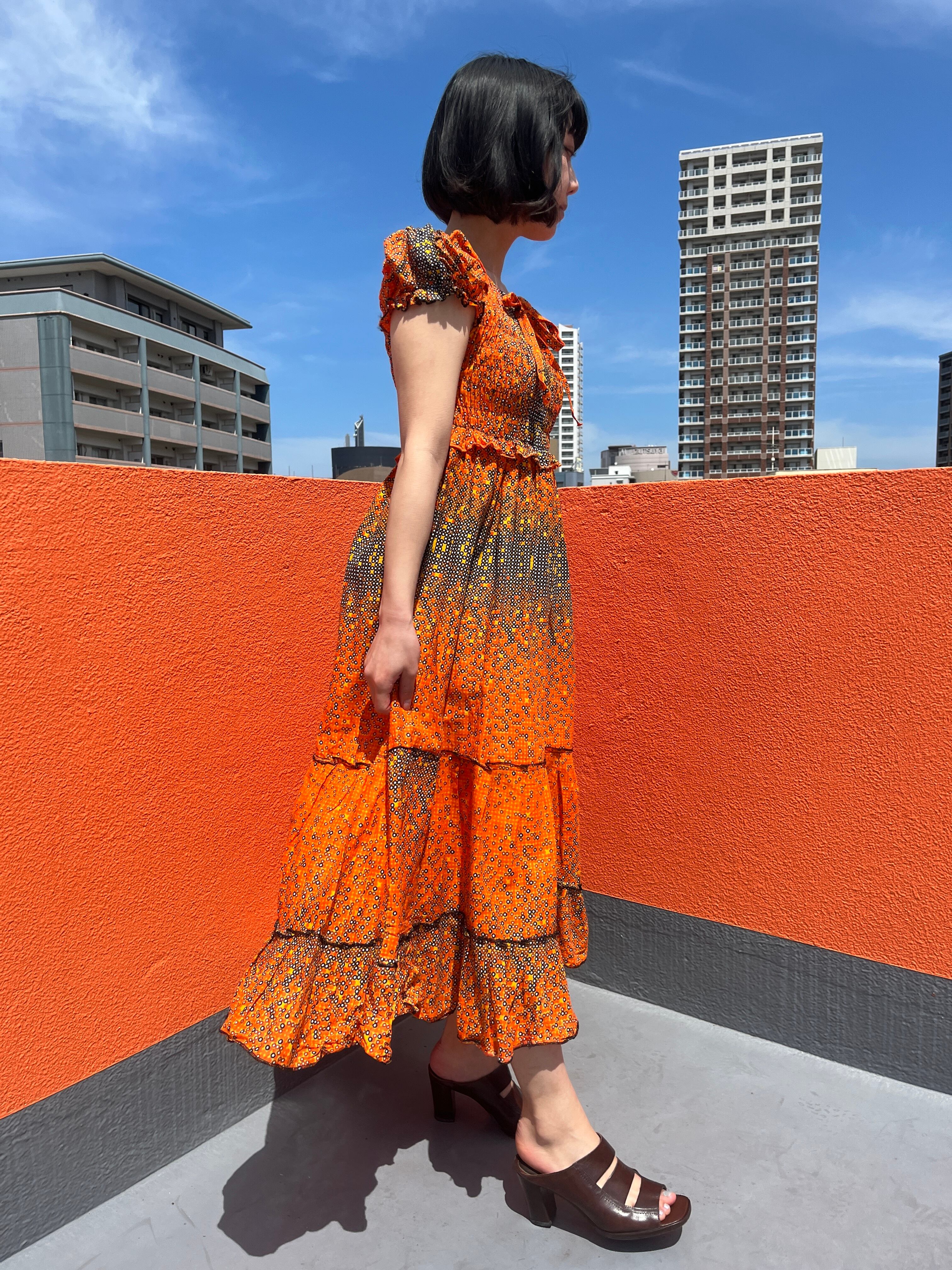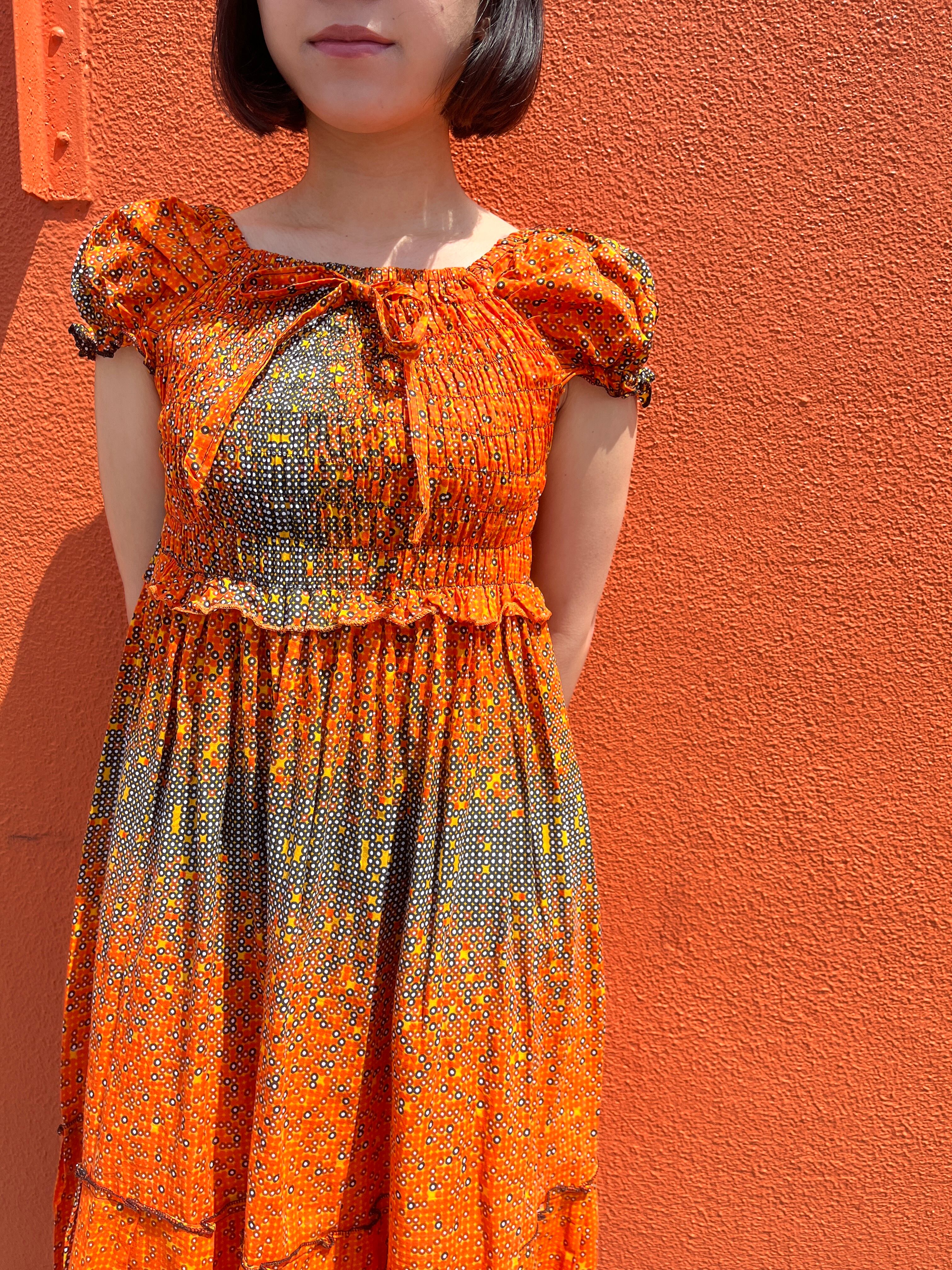 オレンジ×ブラックのドット柄ワンピース。
