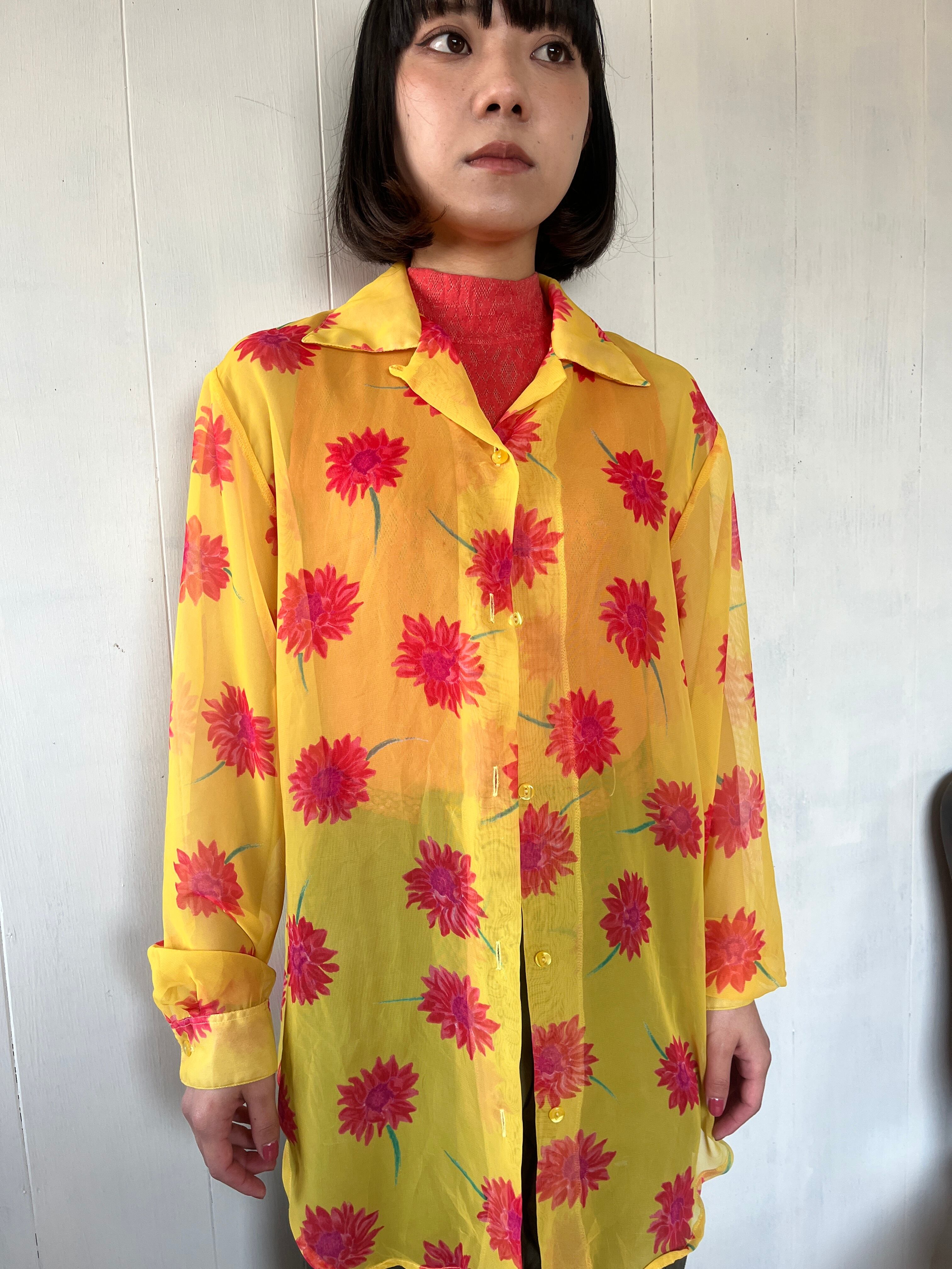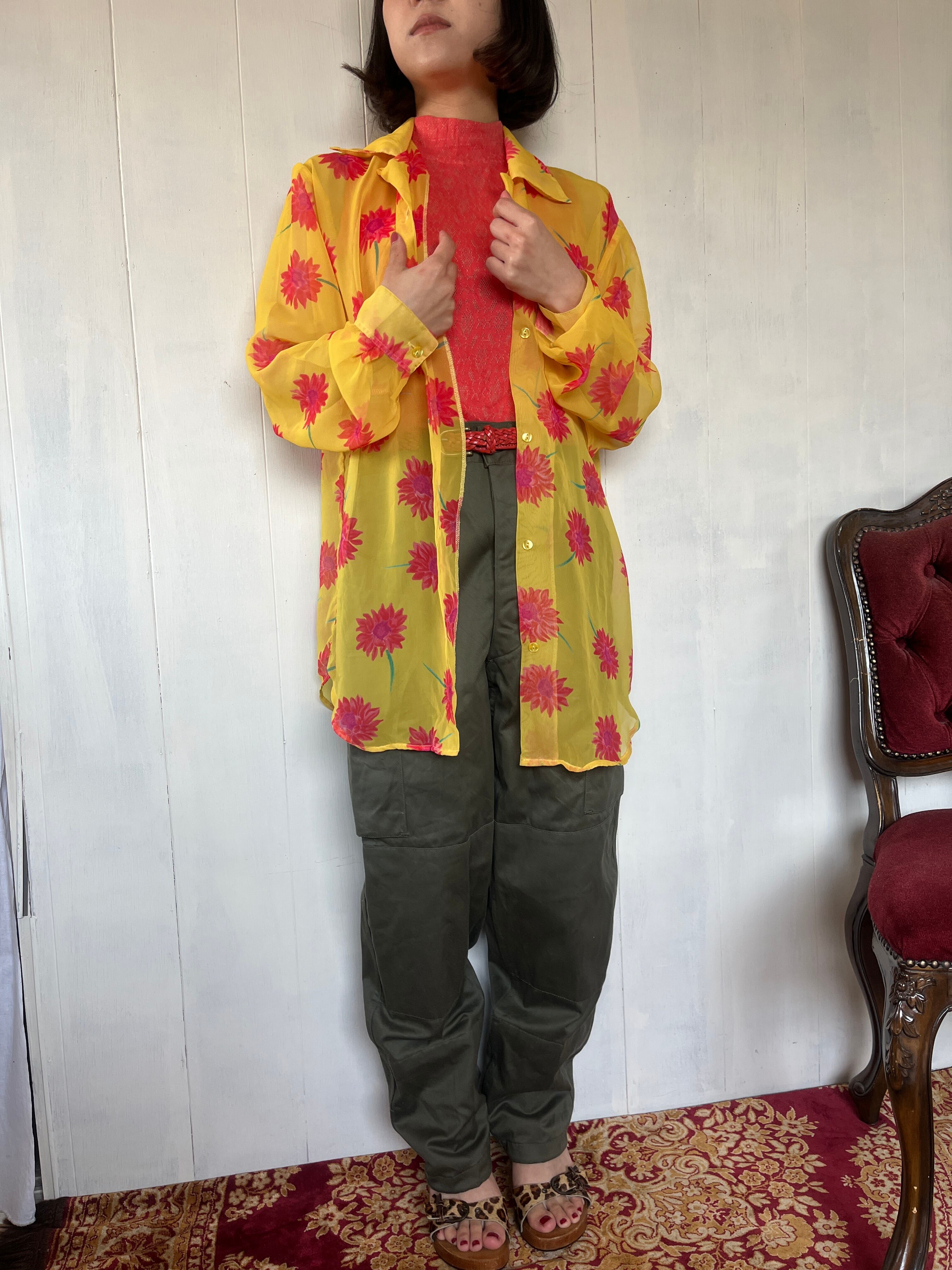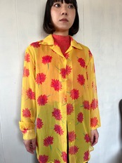 こちらはビビットなイエローに濃いピンクのお花柄が目を惹く一着。