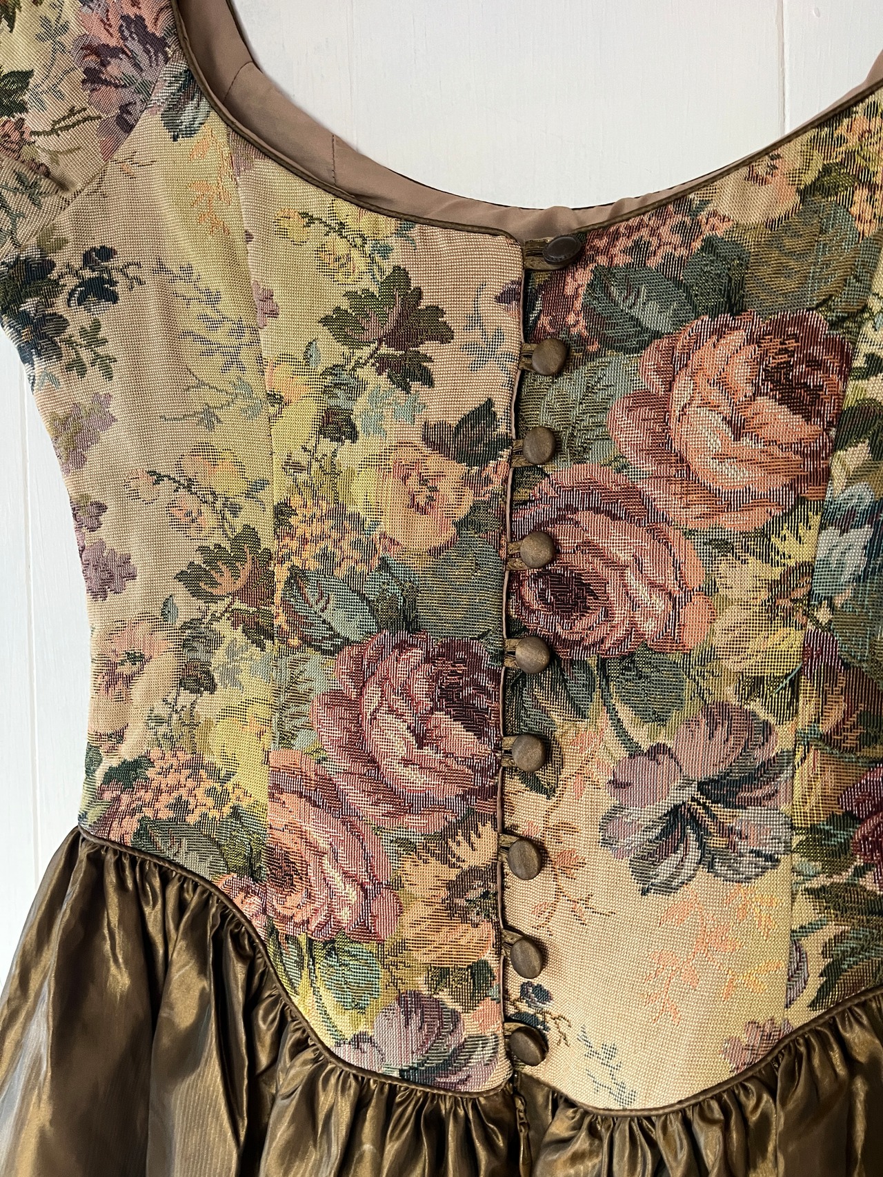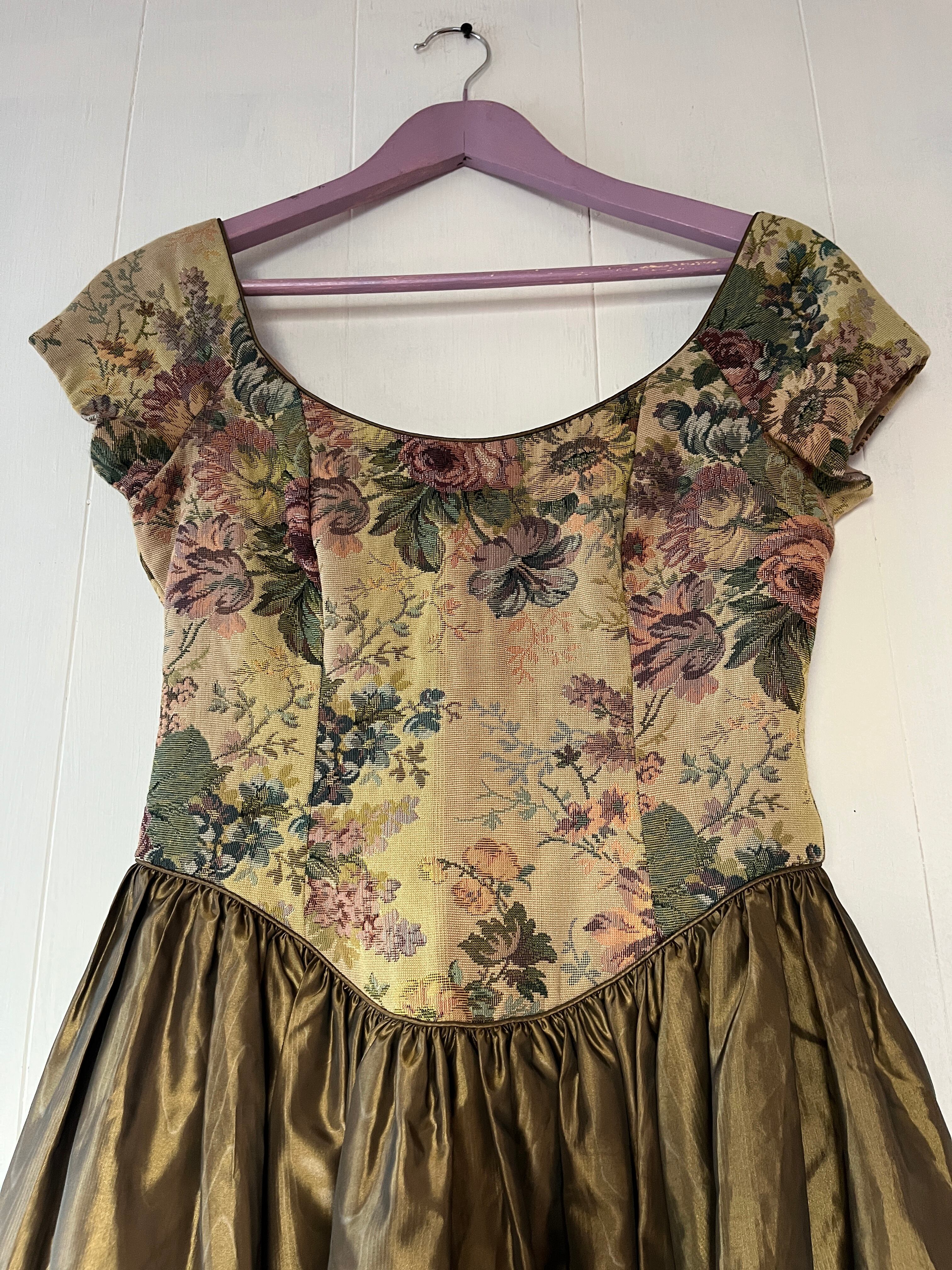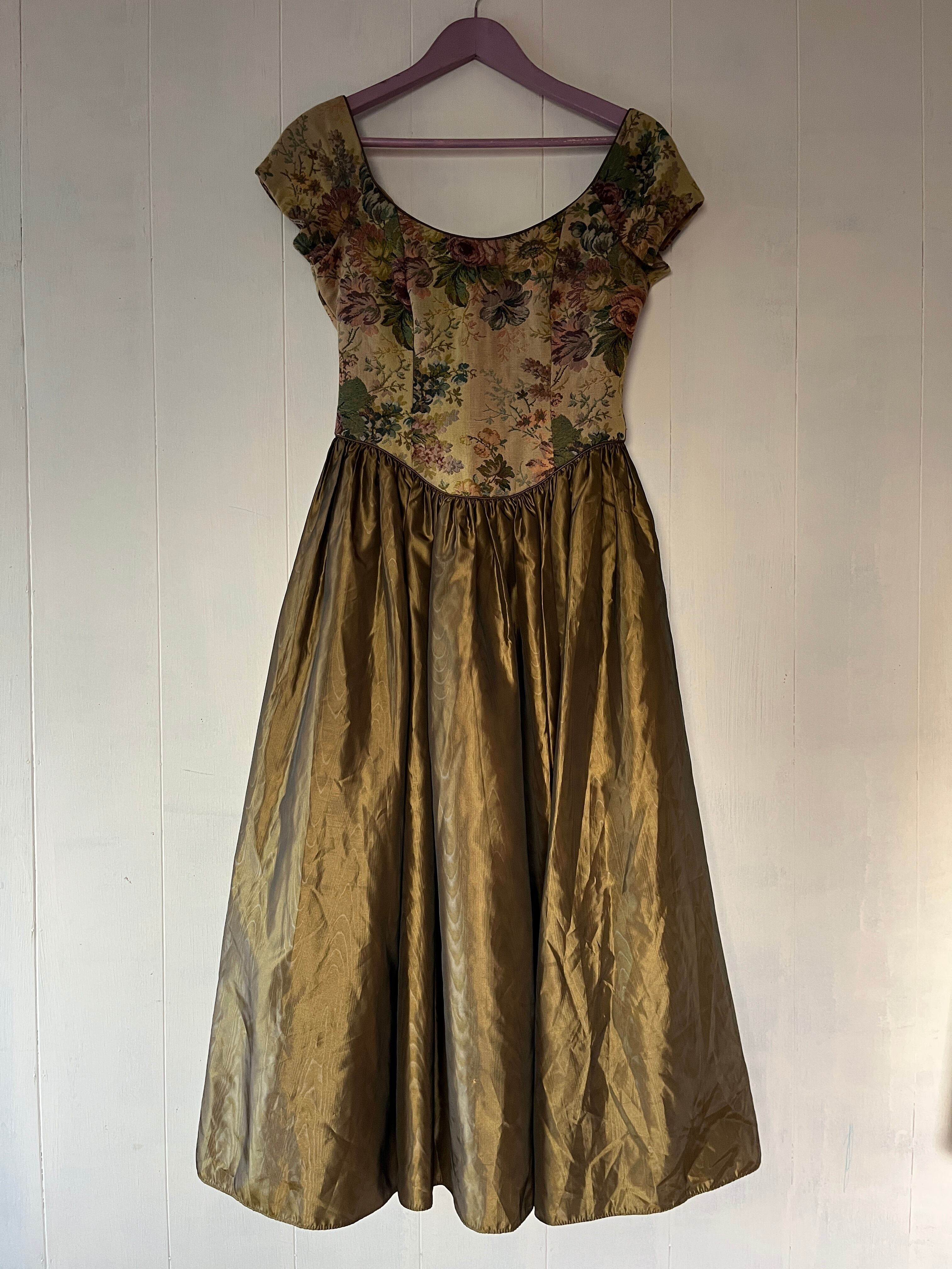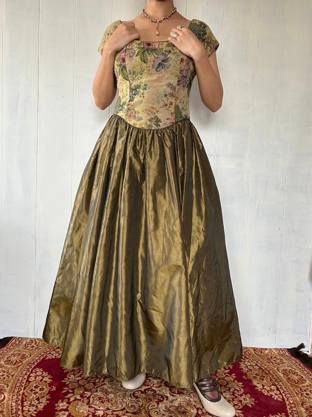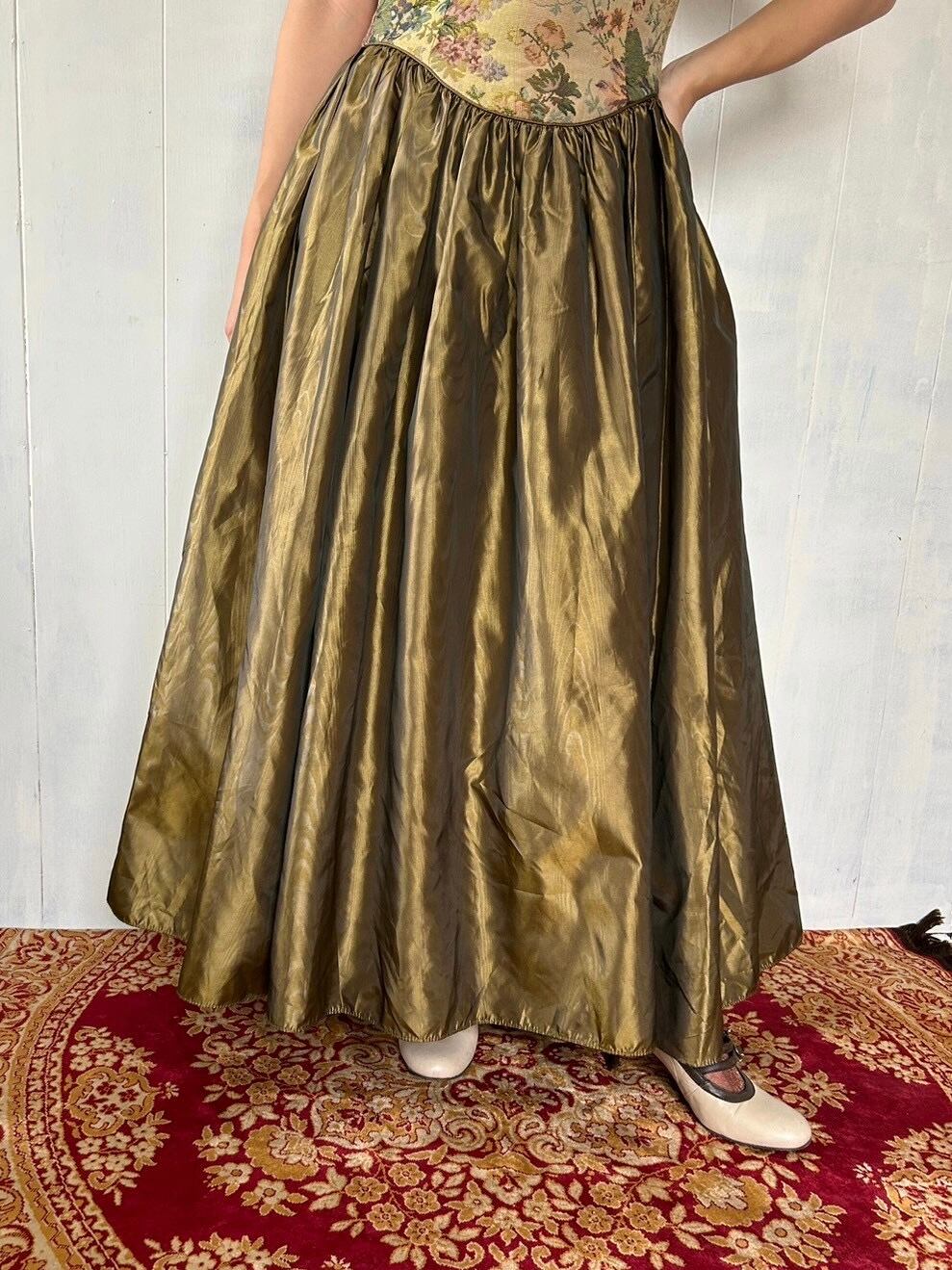 カーキ〜ゴールドのスカートは光沢感があり、うっすらと波紋柄になっております。