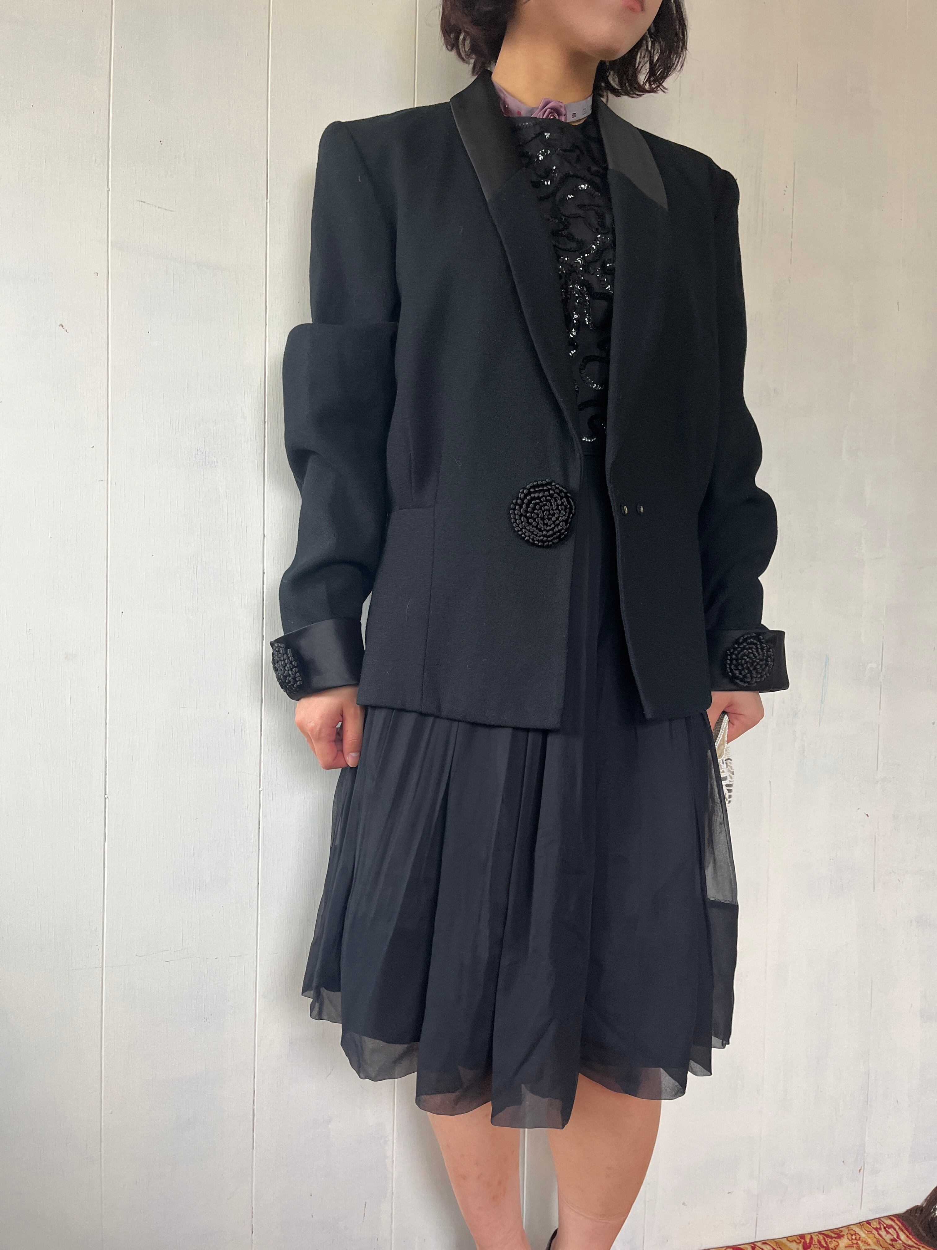 オールブラックで身頃部分のスパンコール刺繍のデザインがキラキラとして目を惹きます。