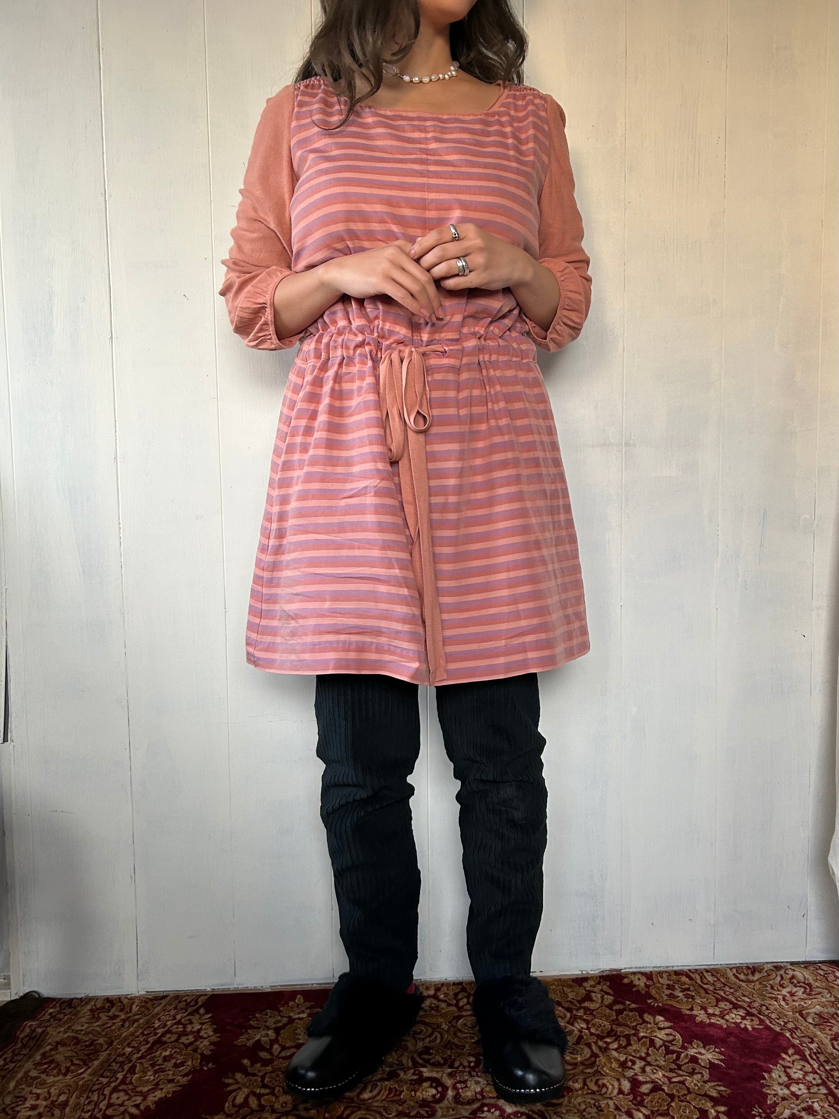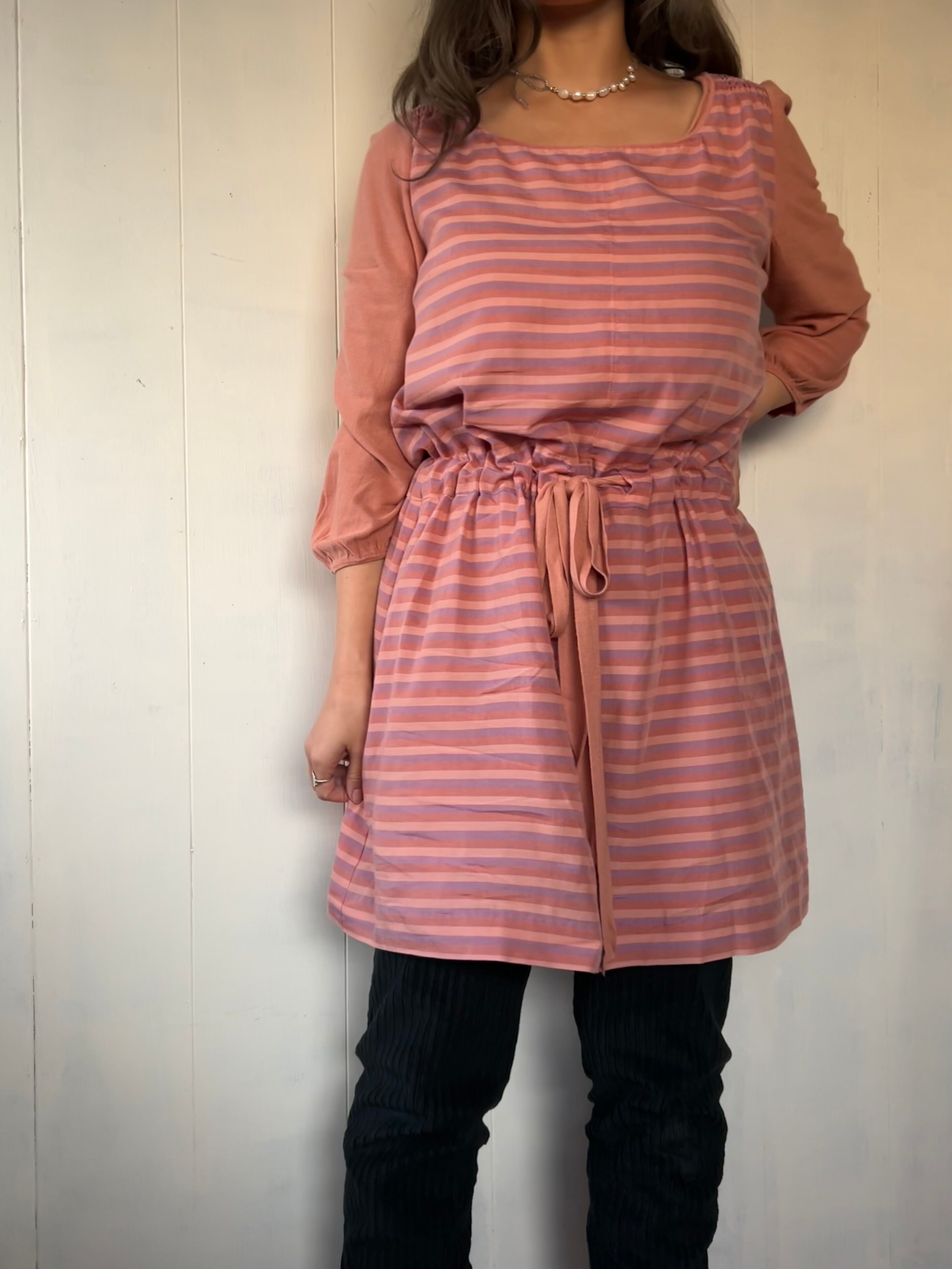 ピンクのマルチボーダーワンピース。
