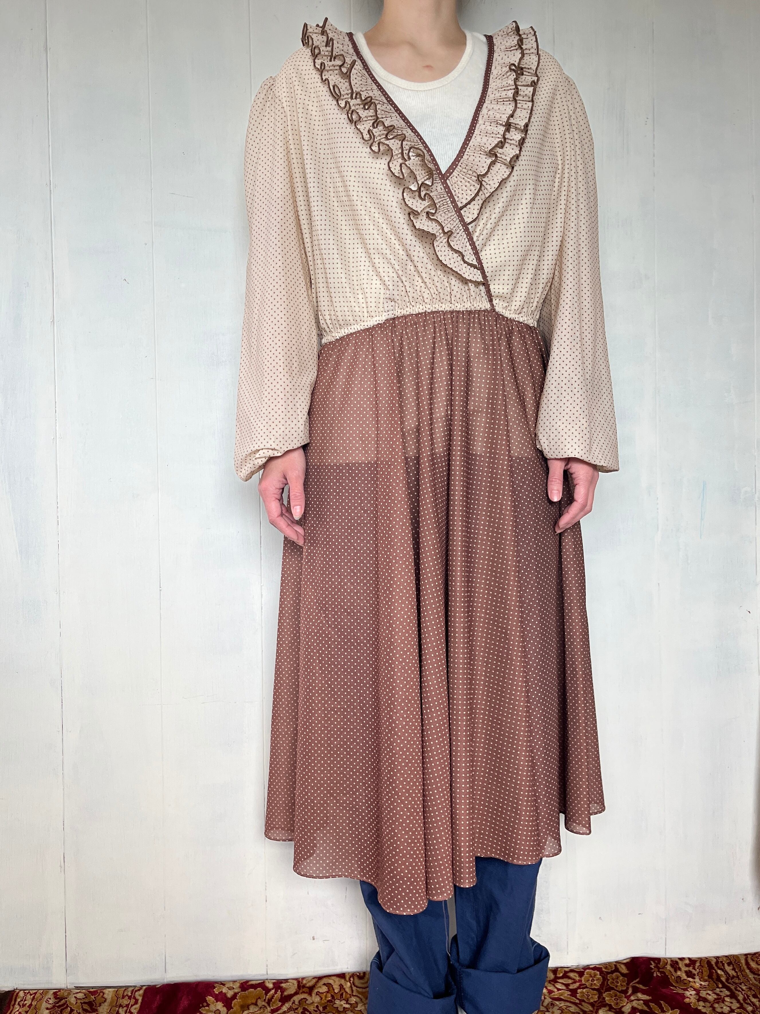 ブラウン×ベージュのドット柄ワンピース。